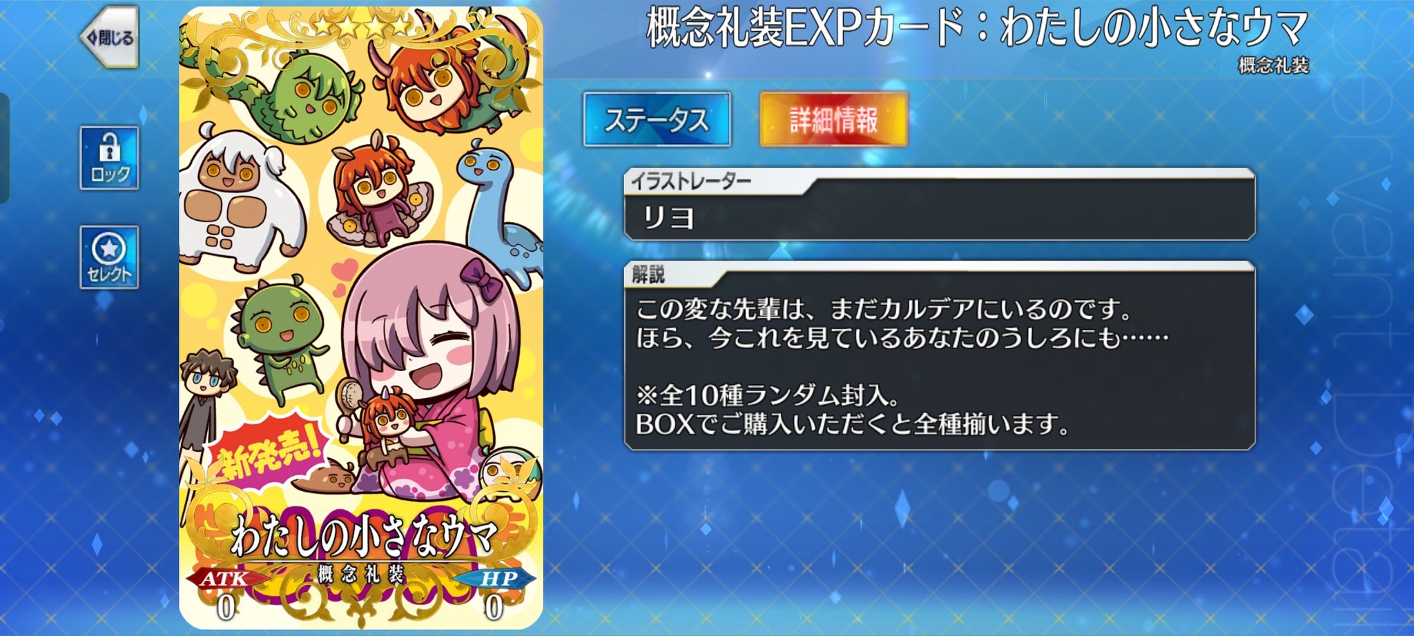 >"This strange Senpai is still in Chaldea.>See, look behind you and there's one right there...>※There are 10 types in total, that are random.>If you purchase a whole box, you'll get all the varieties."