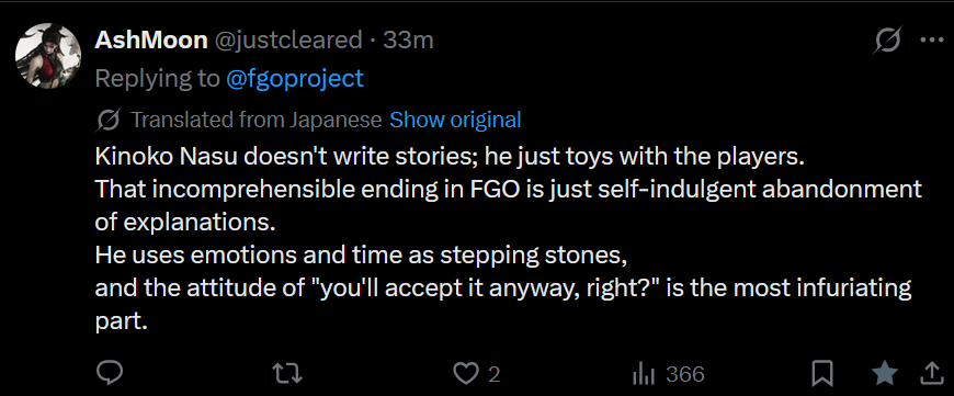 http://www.typemoon.org/bbb/diary/#1Nasu have a feeling of loss and he's happy the players feels the same.Another good news : he praise『Clair Obscur: Expedition 33』 and that give him inspiration.