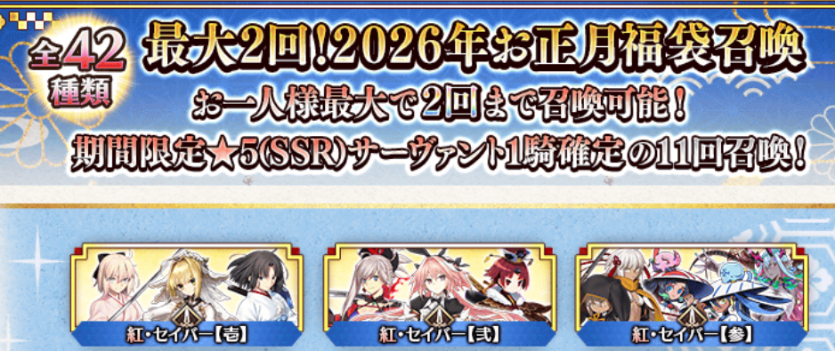 Previous: >>552152129>2025 New Year's Campaign:●January 1~15 JST.▶Present: 30 SQ, 20.26M QP and a Commemorative CE.>2026 New Year PU summon:●January 1~14 JST.5*Saber Lord Logres●January 3~5 JST.5*Pretender Phantasmoon4*Caster Miyu Edefelt●January 4~6 JST.5*Berserker Arjuna Alter4*Archer Aśvatthāman (story locked)●January 5~7 JST.5*Lancer Biscione4*Caster Daikokuten●January 6~8 JST.5*Archer Tutankhamun4*Caster Yui Shōsetsu●January 7~9 JST.5*Assassin Huyan Zhuo4*Avenger Xu fu●January 8~10 JST.5*Rider Takeda Shingen4*Berserker Nagakura Shinpachi●January 9~11 JST.5*Ruler Mélusine4*Archer UDK-BarghestAll limited.https://news.fate-go.jp/2026/newyear2026_pu/>/fgog/ Friendlist form and spreadsheet (2026):https://forms.gle/WK4dwSC6Mn2WQfZu8https://docs.google.com/spreadsheets/d/1leQ09m5klFajbCcededkANJfeMiAmVz-PbCI_r7xyXc/edit?usp=sharing>Utility links:https://pastebin.com/iaWmXAq7