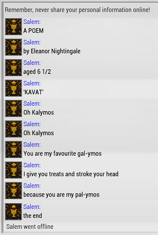 >Talking to Lyon and apparently pick a bug option that doesn't result in the chat ending or a response>"Well guess I'll try to fix it the next day">Get an entirely different chat, but this one works>Except now Roathe's chat is broken and he says how he's looking forward to reuniting the family, but there is no follow up nor does the chat end>"Maybe it'll fix itself like Lyon's.">It doesn't.Why is the messenger so buggy this time around? Am I just fucked on completing the chats and have to do the end of year reset?