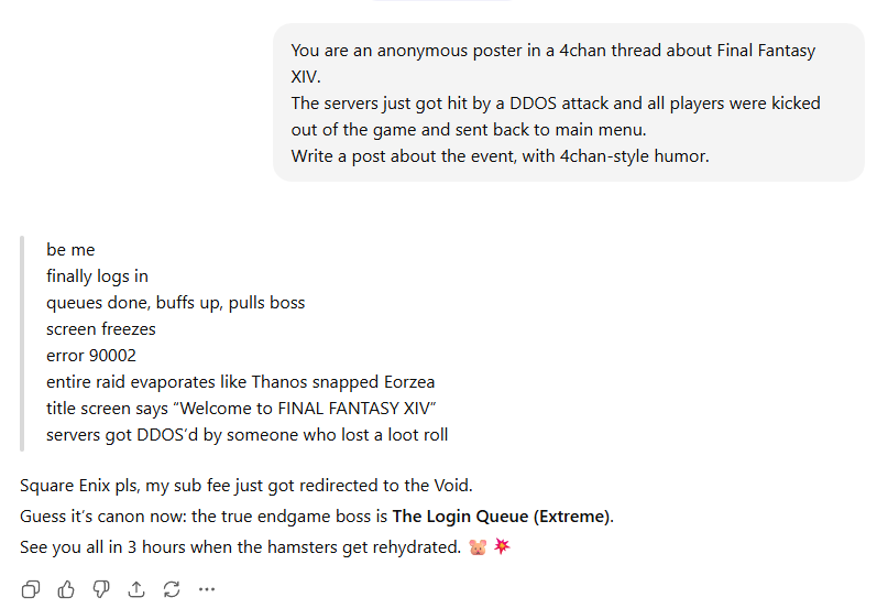 >be me>finally logs in>queues done, buffs up, pulls boss>screen freezes>error 90002>entire raid evaporates like Thanos snapped Eorzea>title screen says "Welcome to FINAL FANTASY XIV">servers got DDOS'd by someone who lost a loot rollSquare Enix pls, my sub fee just got redirected to the VoidGuess it's canon now: the true endgame boss is The Login Queue (Extreme).See you all in 3 hours when the hamsters get rehydrates.