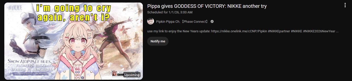 Greatest New Year Event ever>Game Download - Android/iOS/PChttps://nikke-en.com/index.html>General Info/FAQ for New Playershttps://rentry.org/NikkeInfo>Additional Linkshttps://rentry.org/nikghomeALL DATES/TIMES LISTED BELOW ARE UTC+9 (KOREA TIME)>Update on December 30https://nikke-en.com/newsdetail.html?content_id=39c0a1baaa6e2a4974a8f58a8e859cbd14ff>Developer's Note: December 2025https://nikke-en.com/newsdetail.html?content_id=cdd4dd28a9a71a464ca8afdac52e5bb9b7fb>Current EventsARK GUARDIAN - December 30 ~ January 22>Upcoming EventsUnion Raid - January 2 ~ January 8Coordinated Operation: Chatterbox - January 2 ~ January 4Solo Raid - January 8 ~ January 15>Current Special RecruitsSnow White: Heavy Arms - January 1 ~ January 22Rapi: Red Hood [Rerun] - January 1 ~ January 22>Upcoming Special Recruits>Current Costume PassesAlice: Märchen Dream [Gacha] - January 1 ~ January 22Quency Escape Queen: Masquerade Swan [Mission Pass] - January 1 ~ January 22Emma Tactical Upgrade: Secret Therapy [Mission Pass] - January 1 ~ January 30Guillotine: Dark Tracer, Helm: Chandelier & Maxwell: Mechanic White [Shop rerun] - January 1 ~ January 22>Upcoming Costume Passes>Codes2026HAPPYNEWYEAR2026KEEPTACTICAL2026WORKHARDER2026LETSDANCE2026EATBETTERPrevious: >>552150709