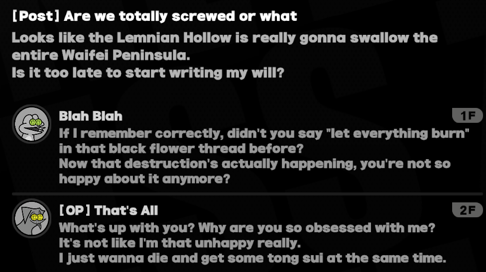 >>552210621This is from the same chapter that finally gives you Marisbury, who turns out to never have an opinion to share on anyone that isn't absolutely full of contempt, and then has everyone else going "Man if nothing else he sure loved humanity to a fault, if only his pet doomsday project understood him better :("Logical characterization, among other things, is simply a lost cause here.