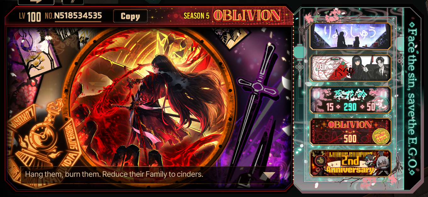 Previous thread: >>552182772Season 7 - Kumo no Ito2025.12.31 —Mirror Dungeon #6 - Mirror of Immortality2025.07.03 —Refraction Railway Line 5 - Merry Go Round2025.02.20 —>Current Events>Current Extractions2025.12.31 — 2026.01.15[000] The Index Proselyte:【Paper Slip】 Faust[000] LCA Udjat Vanguard Team 3 Leader Outis2025.12.31 — 2026.01.22Target Extraction: [ Ryoshu ] ID & E.G.O>FAQs! This game is directly tied to the setting of Project Moon's previous games, Lobotomy Corporation and Library of Ruina, and is set after both. Expect spoilers for those games in this thread.! The tutorial is important.>Download linksAppStore: https://apps.apple.com/app/limbus-company/id6444112366Google Play: https://play.google.com/store/apps/details?id=com.ProjectMoon.LimbusCompanySteam: https://store.steampowered.com/app/1973530/Limbus_Company/>Other linksOfficial twitter: https://twitter.com/limbuscompany_bOfficial youtube: https://www.youtube.com/@ProjectMoonOfficialOfficial site: https://limbuscompany.global>Required readinghttps://mega.nz/folder/xosDkZ5Z#Wt4JpUt5Bb2XG77pxuuXpw>For all your EGO and Sinner info needshttps://limbus.kusoge.xyz/https://gll-fun.com/en/>Useful resources and a general guidehttps://rentry.org/lcg_resourceshttps://rentry.org/lcbguidehttps://rentry.org/LCB_optimal_grind_guidehttps://lcb-days-since-last-id.carrd.co/https://lcb-days-since-last-ego.carrd.co/>Countdownhttps://lcbcountdown.carrd.co/
