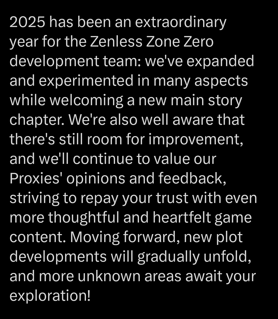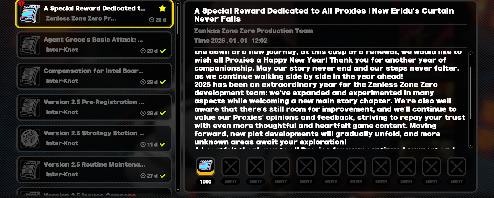 Previous: >>552181062>NewsVersion 2.5 Special Programhttps://youtu.be/Ldeqt2WMiYMTGA 2025 Special Videohttps://youtu.be/X-g1N9mNjzsAgent Record | Ye Shunguanghttps://www.hoyolab.com/article/42397862Agent Record | Zhaohttps://www.hoyolab.com/article/42343300>Newest Trailer/Teaser/Character demohttps://youtu.be/35fRoOYhE6Y (EN)https://youtu.be/BSKG5nhlj5s (JP)https://youtu.be/D_MtaEZRy3E (EN)https://youtu.be/eJBlfglfs-4 (JP)https://youtu.be/9Lshum4Peqw (EN)https://youtu.be/oCcNiUZ5ogU (JP)https://youtu.be/TU5Bt8MLPjk (EN)https://youtu.be/bviZmH3w5ew (JP)>Upcoming Events for 2.5https://zenless.hoyoverse.com/en-us/news/161728All-New Program 12/29 - 02/05Special Visitor 12/29 - 02/09Potential Hypothesis New Chapter Reforged 12/29 - 02/09Sword Seeker Chronicles 12/31 - 02/05Joint Investigation: The Divine Maze 01/03 - 01/22Shadow Riptide Clash 01/09 - 01/26Wish Filing Station 01/14 - 02/02Advanced Bounty: Area Patrol 01/16 - 01/21"En-Nah" Into Your Lap 01/21 - 02/05Angels and Delusions of Muse 01/21 - 02/05Data Bounty: Combat Simulation 01/30 - 02/04Angels of Delusion Training in Progress 01/30 - 02/09>Redeemable codes (claimable in-game or online)https://zenless.hoyoverse.com/redemptionZENLESSGIFTZZZ24KRAMPUSZZZCREATOR25ZZZ25MINAZHAOISFREE MEETTHEVOIDHUNTERShunguangWinterGiftZZZ2026>Resources and useful linkshttps://rentry.org/zzzlinkshttps://rentry.org/ZZZ-Friendshttps://rentry.org/ZZZ-Guilds>/zzz/ OP pastebin (use this if making new thread):https://pastebin.com/PzbMf13P