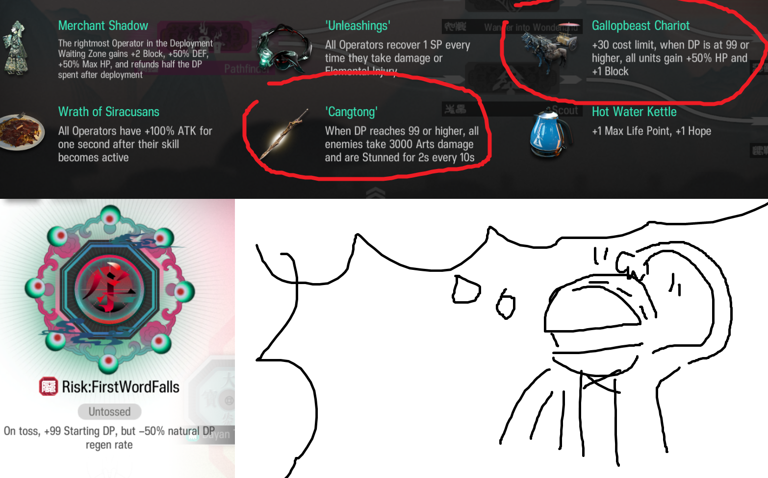 >hey, what if we took a floor 3 boss that makes it kinda annoying to use ranged tiles because of the Jessica event snipers and made an emergency version that makes it literally impossible to use ranged tiles because the boss will steal all the operators, and even once he's dead we will drizzle the talisman chuckers that walk right by every single high ground tile?>sounds good, but let's also add the ranged berserkers for absolutely no fucking reason as wellI well and truly don't get it
