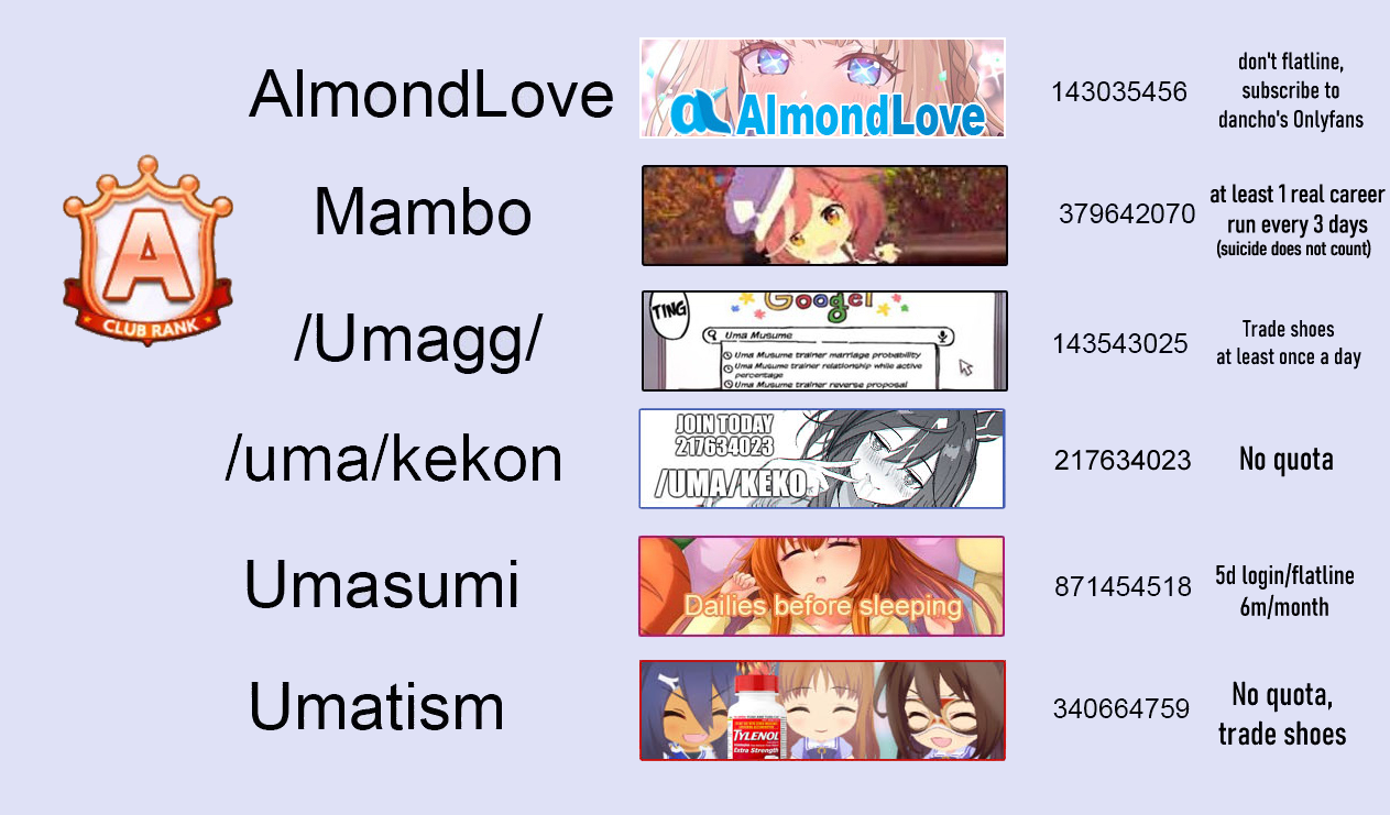 I am once again putting out there that, if you're interested in joining the latest of the /uma/ clubs, Autis/uma/, you can apply with the club ID 231973146 or reply to this post with your Trainer ID for an invite once your timer expires. We still have plenty of slots open.See you on the track, gamers.