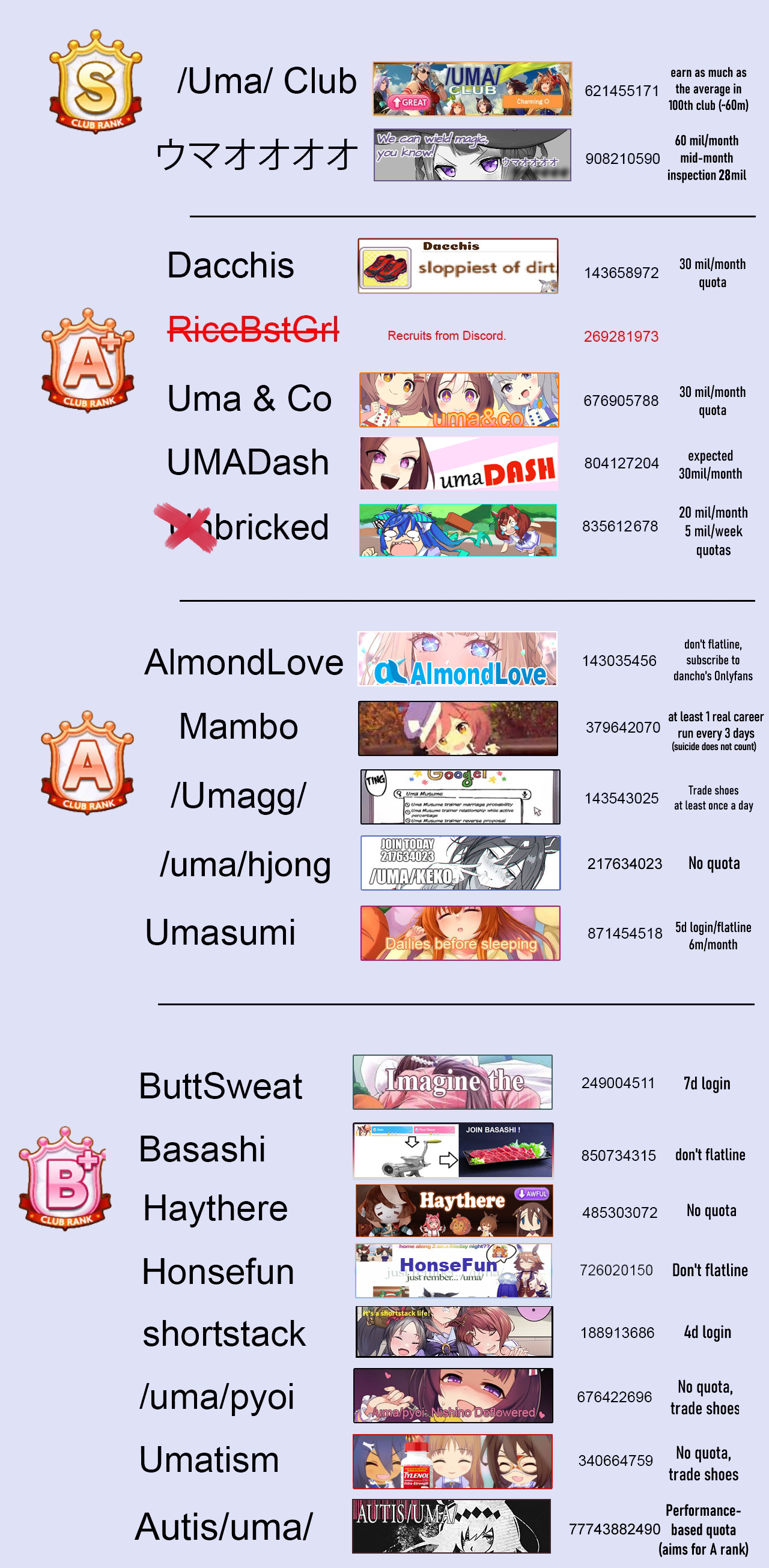 For newfags or those that will be joining clubs. This is what club ranks are summarized>SConsider it as if you're wageslaving >A+ This is if you want a team effort of 1M daily minimum>AThis is where you pray for someone to do fan runs out of their goodwill while most do 1 run per day>B+Still a team effort of everyone doing a minimum effort of 1 run per day>B belowflatliners central anything goes >/v/ niggeryI literally did not read the past thread to care about any of these