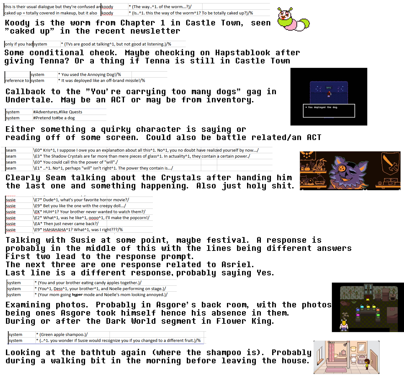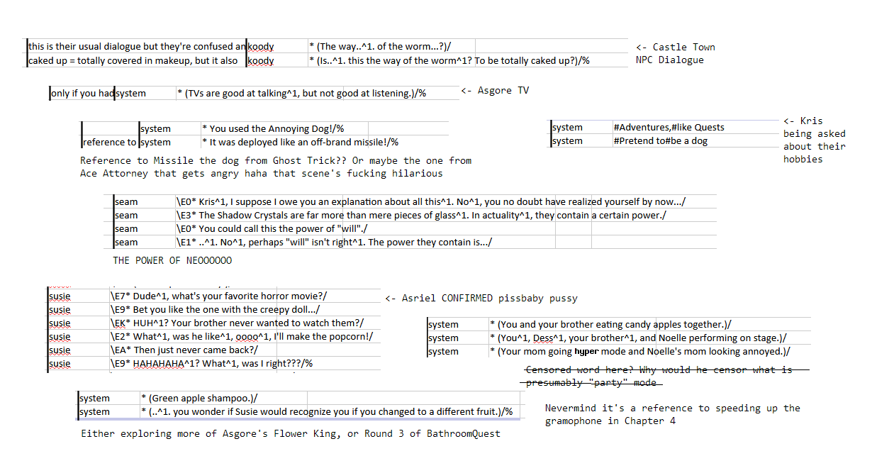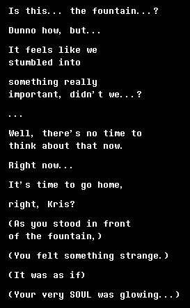 >>552313649The shelter narration uses a dramatic register the game also deploys when closing dark fountains. I don't remember if those are the only places. The text scrolls very slowly and there's no text beeps.Past tense more generally is also used to describe the result of ACTs (e.g. "* You brought up the topic of Animals." but not "* Clover flashes a trio of terrible smiles." because that's flavor text and not the result of an ACT) and of many overworld interactions (e.g. "* (You got the Dark Candy.)" but not "* (There's a candy hanging from the tree.)" because that's flavor text and not the result of your choice).These rules aren't applied rigorously. For instance "* (You decided not to sit.)" but "* (You decide not to read it.)".