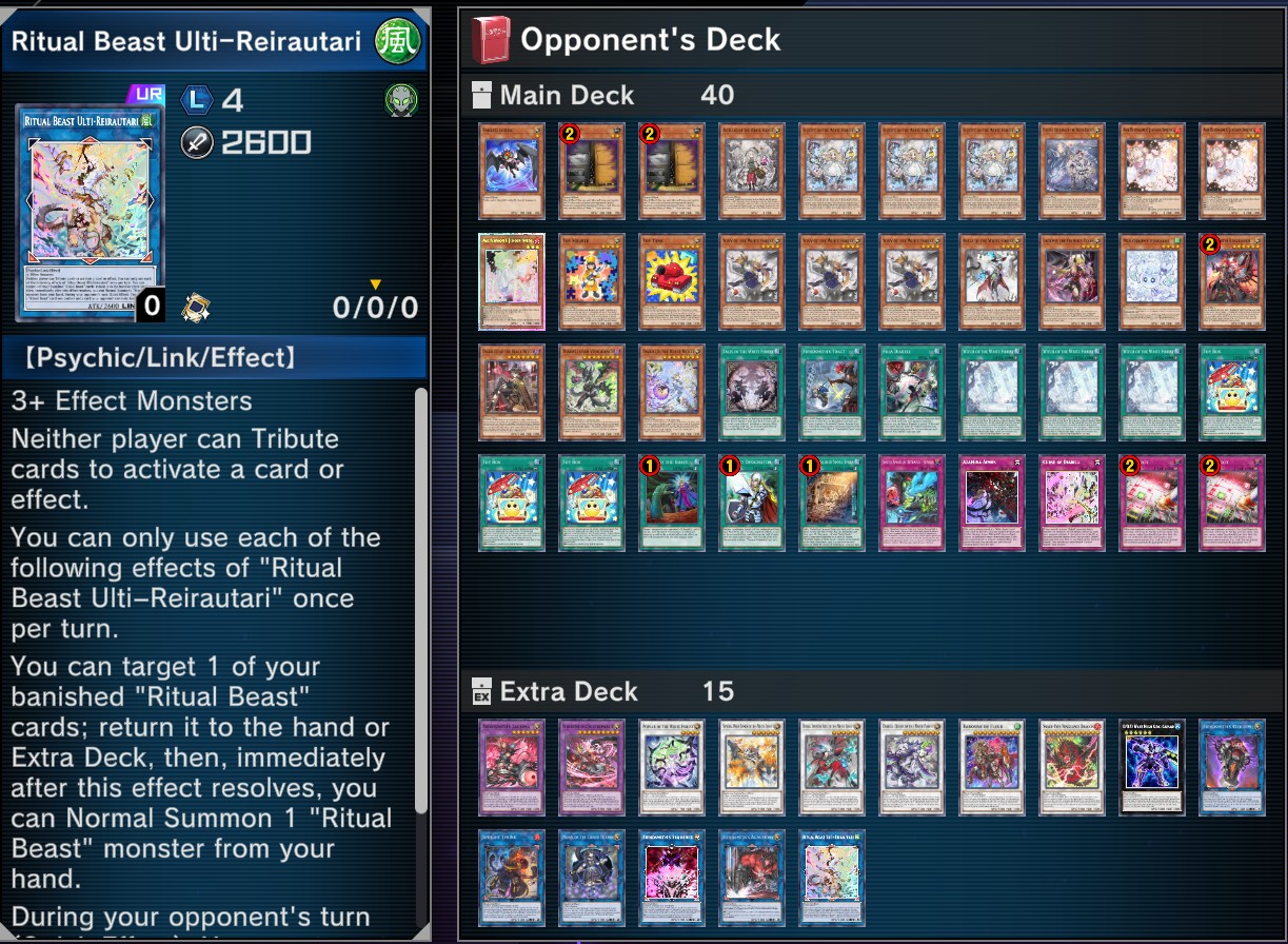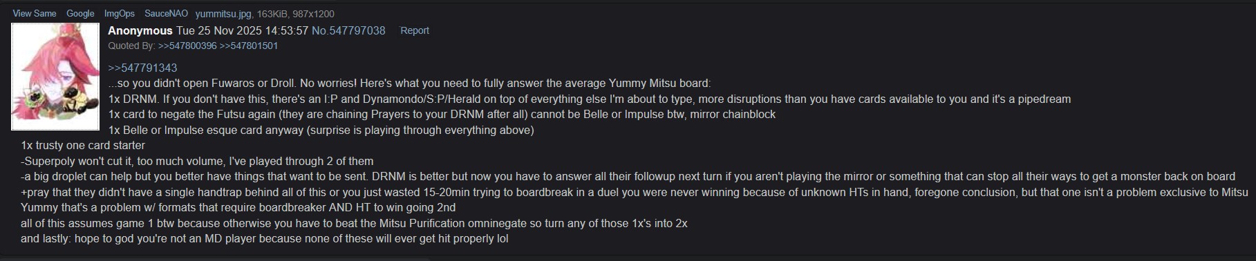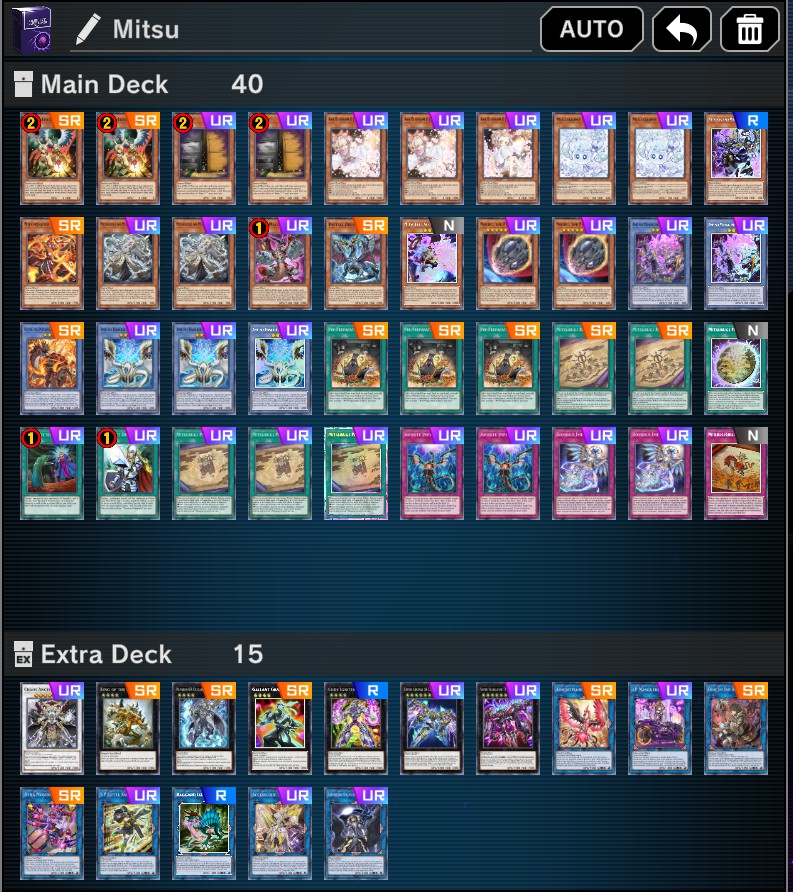 >>552498913I'm probably one of the few players who just make their own decklists. I look at every card in the archetype and every out-of-archetype tech card that other people use and pick the ones I like, instead of copying decklists and watching guides.I adjust ratios before testing for the first time in Solo Mode, then do more adjustment after a few duels there, then do even more adjustments after trying it out in PvP a few times. Even after a while and a lot of duels, you'll still find some things that you'd wanna adjust.
