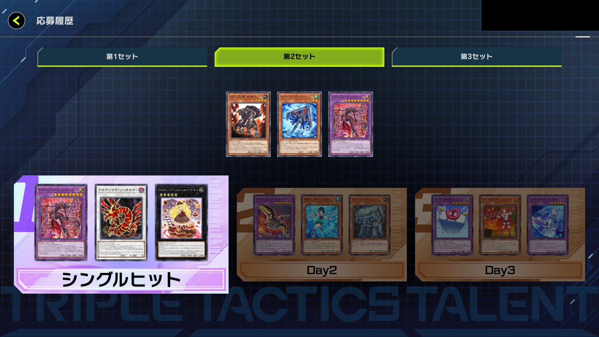 Known Single Hit winners in the Triple Tactics Talent event (27 in total)>2 got Speedroid Wing Synchronhttps://x.com/purotein6ki6ki/status/2004909996136698204https://x.com/EasyBot_exe/status/2004355164724252951>9 got The Trojan Horsehttps://www.reddit.com/r/masterduel/comments/1pv61wr/comment/nvvl9kw/https://x.com/Kero_maple/status/2004121280761798825https://x.com/SsoTJZKE1JuMMKb/status/2004086927084191997https://x.com/punk_Kerberos/status/2004150344574714160https://x.com/HistoryMatters7/status/2004161400344924347https://x.com/umm_mushipan/status/2004143592173166644https://x.com/CYAC_JP047/status/2004063905296142794https://x.com/hayamin_h2o/status/2004399571141890351https://x.com/arknight59/status/2004074198785052706>4 got Vampire Suckerhttps://www.reddit.com/r/masterduel/comments/1pv61wr/comment/nvvx5bg/https://www.reddit.com/r/masterduel/comments/1pv7pl6/triple_tactics_talent/https://x.com/William97066/status/2004059962511970758https://x.com/nyf_nyf_nyf/status/2004066252537651597>1 got Link Infra-Flierhttps://www.reddit.com/r/masterduel/comments/1pxjtjm/that_0_atk_mathpick_suggestion_coming_in_clutch/>2 got Despian Quaeritishttps://arch.b4k.dev/vg/thread/551521815/#551730385https://x.com/DKING44111/status/2005175844076204506>3 got Great Phantom Thiefhttps://x.com/Aoi_okra43/status/2006285695569244337https://x.com/ZawaAI114514/status/2006340862310253049https://x.com/arika_oku/status/2006350436723490979>2got Heroic Champion - Jarngreiprhttps://x.com/z86BR5qbvP29689/status/2006296230075523390https://x.com/ritomas1/status/2006313101801701459>4 got Meotokohttps://x.com/kunaroku/status/2006255765049536714https://x.com/draneko0927/status/2006285701244215706https://x.com/hatano_kiyoshi/status/2006268870215315787https://x.com/amu_sisetu/status/2006387722118996205So that's a maximum of just over 37k gems per winner, and there's likely more Single Hit winners that just haven't posted their results.Didn't find any Double/Triple Hits.