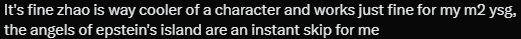 >>552386707That line Yixuan had about being around more after the event made me think even the writers are admitting they've sidelined her too hard.
