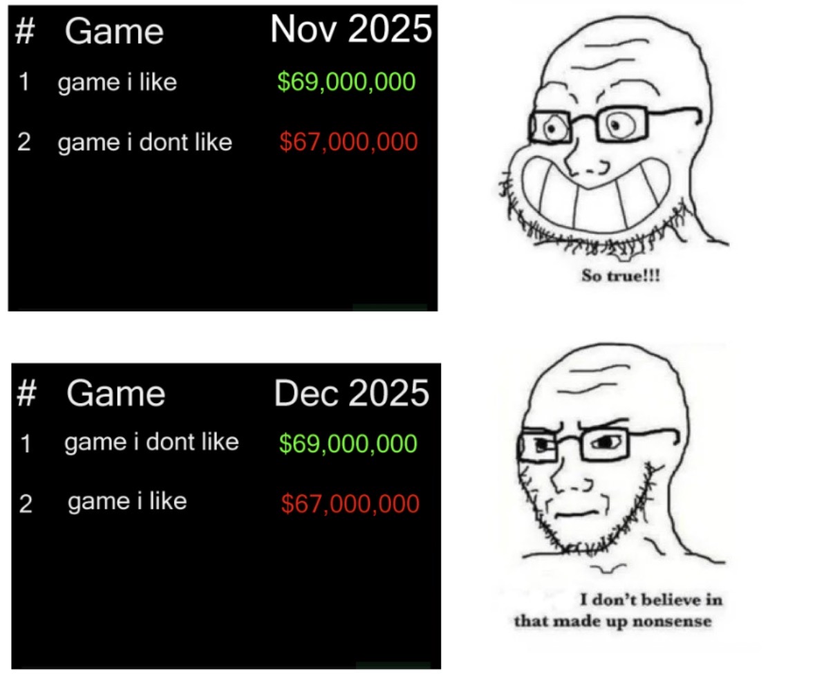 >>552395653You disingenuous scumbag. You've been bombarding us with the fake sale charts for fucking months, and now you're going to use it to shitpost because the made-up sales don't align with what you're saying?