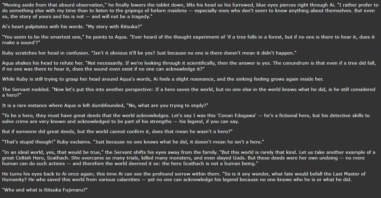 >>552435364I guess narratively yeah, I don't even know the finer points of the FGO ending other than it being a reset... but from the character's perspective, the ending is way worse.>>552436168I don't even care about the reward, but why can't (You) atleast retain your memories? it would be so much better, just a bittersweet ending, instead of this open ended memory wipe shit. I really hate this memory wipe shit they do. It worked for Seraph/OC1 because there was still work to be done, still bonds to be forged, but what happened to the bonds when you don't even have the chance to connect with those servants who fought besides you over 10 years?