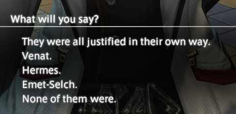 I picked none of them were justified btw, Venat speaks of love for her children and not wanting everyone to become enslaved to zodiark but thats basically the same as Elidibus/the ascians picking a course for everyone, they both forced everyone's hands.