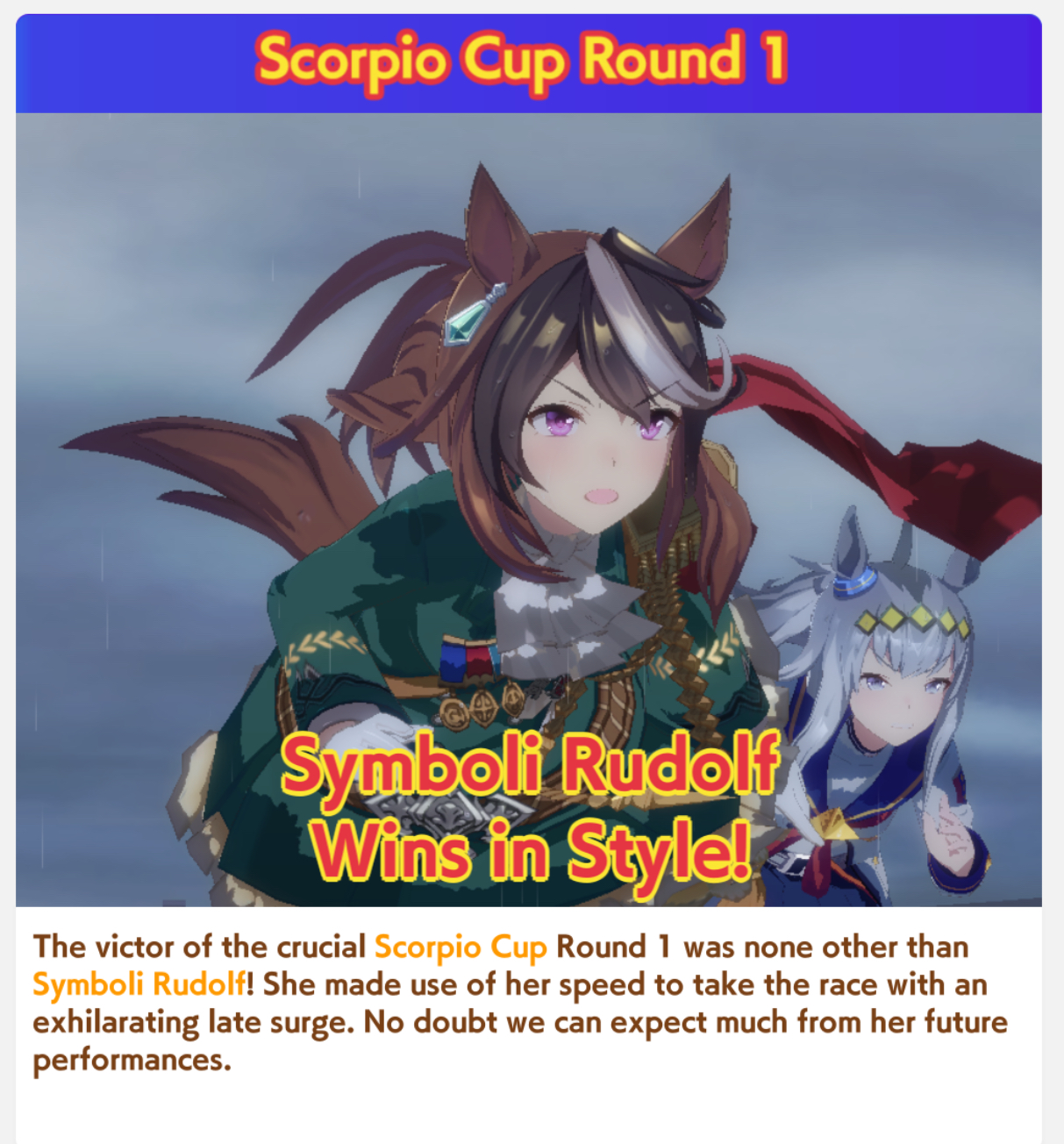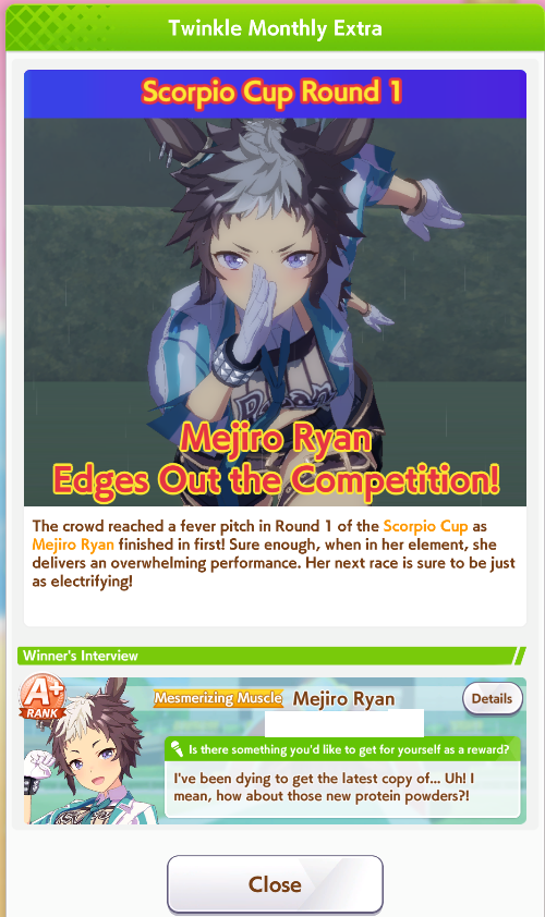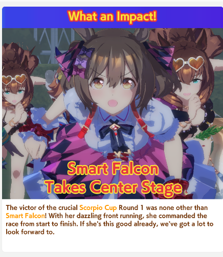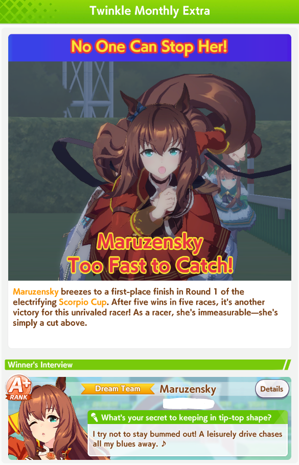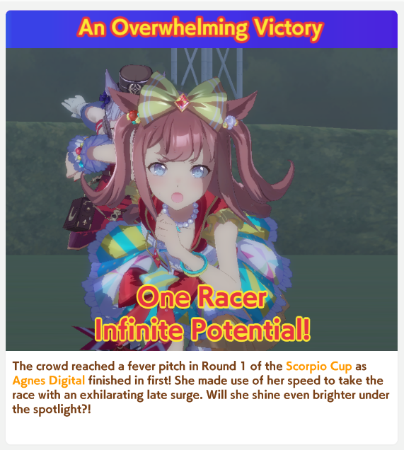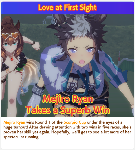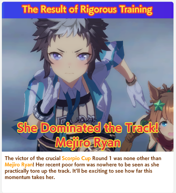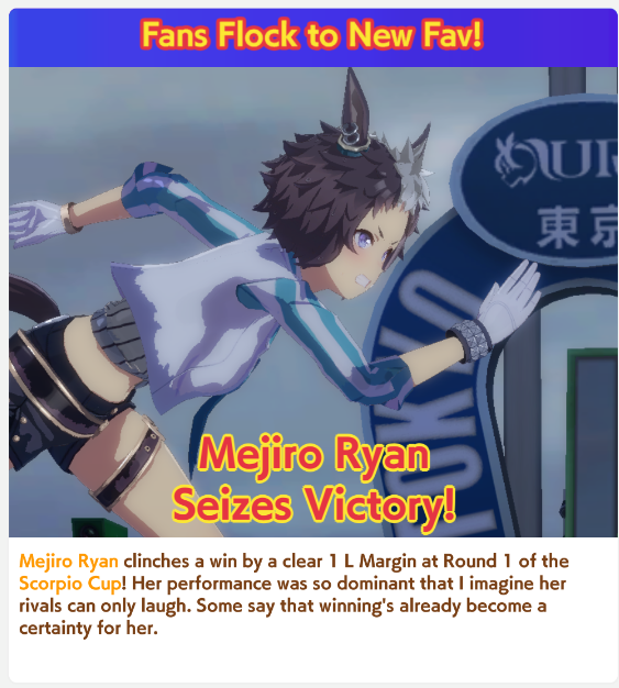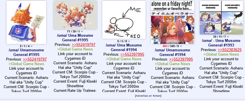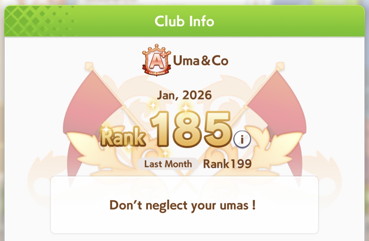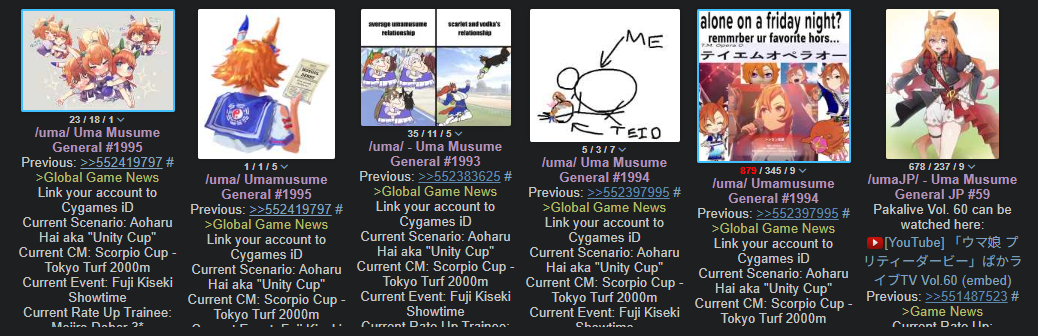 Previous: >>552419797>Global Game NewsLink your account to Cygames iDCurrent Scenario: Aoharu Hai aka "Unity Cup"Current CM: Scorpio Cup - Tokyo Turf 2000mCurrent Event: Fuji Kiseki ShowtimeCurrent Rate Up Trainee: Mejiro Dober 3*Current Rate Up Support Cards: Daitaku Helios (SSR), Vodka (SR)Late January - Sagittarius Cup - Nakayama Turf 2500mhttps://umamusume.com/news/100040/https://pages.snep.pw/uma/anni-skill-changes/>JP Game NewsCurrent Rate Up: NY Sakura Laurel 3*, NY Ikuno Dictus 3*, Oguri Cap 3* (Forma de Cinderella), Stay Gold 3*, Air Groove (Speed SSR), Fine Motion (Power SSR) Inari One (SSR), Mejiro Dober (SR)New Scenario "Yukoma Hot Spring" releasedTimeline: https://uma.moe/timelineCygames Webstore: https://webstore.cygames.com/en/umamusume_en/>IP NewsUmamusume Cinderella Gray 2nd season started weekly airings on 10/5>Thread Clubshttps://rentry.co/umaglobalclublistYou must be E3 (20k points) to join a circle. Apply with /uma/ or /vg/ in your profile or post ID in the thread.>All Guides & Resourceshttps://rentry.org/uma26Game databasehttps://gametora.com/umamusume (Click the gear to switch between JP / global server info)A basic guide for newfagshttps://rentry.org/umaglobalFind networks if your region is blocked from the game or clienthttps://www.umavpn.top/93Seiyuu & Concertshttps://rentry.org/umstUma Texthttps://umareader.idsmile.xyz/