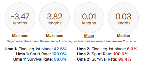 >>552440837https://kachi-dev.github.io/uma-tools/umalator-global/>>552441042mean and median are the important ones. the spurt/survival% is somewhat important. the "is first" is either completely irrelevant or incredibly important, depending on your build.