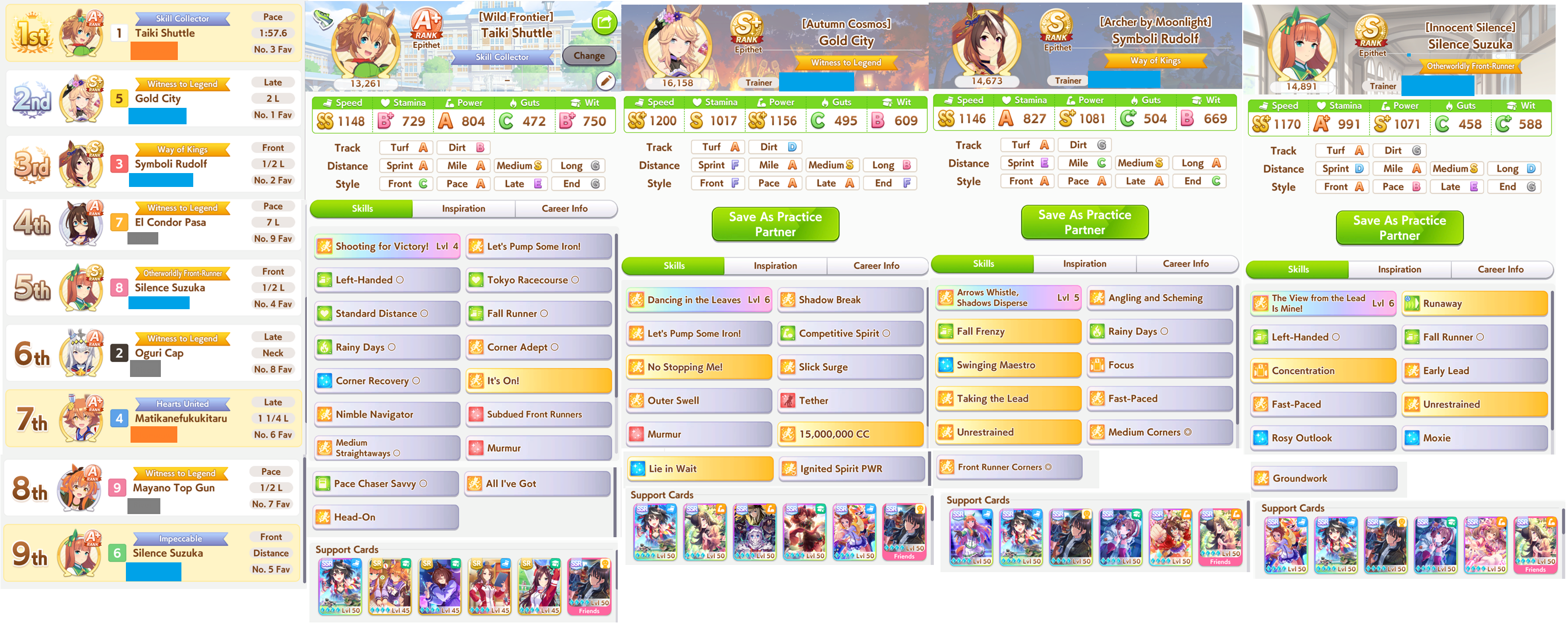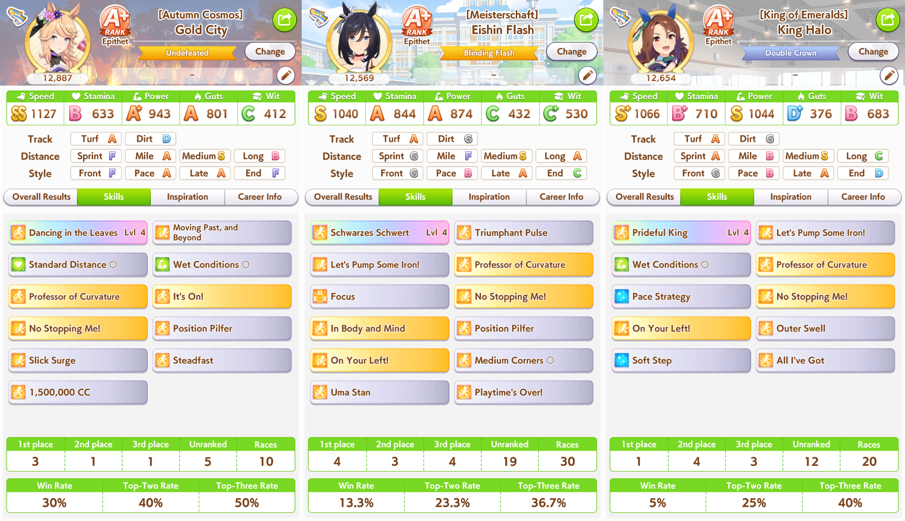 >>552453684>lot of good skills on Eishin and City>400 and 500 wit respectivelyThat not only affects skill procs, but those umas may not be efficiently position keeping or moving up. I also notice City with 600 stamina and a green, but you have a lot of guts to make up for it. I still think that plays with fire a good amount.