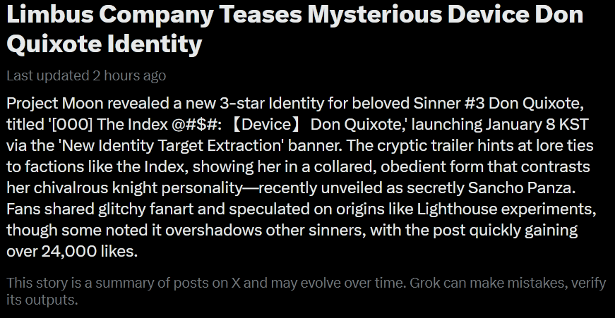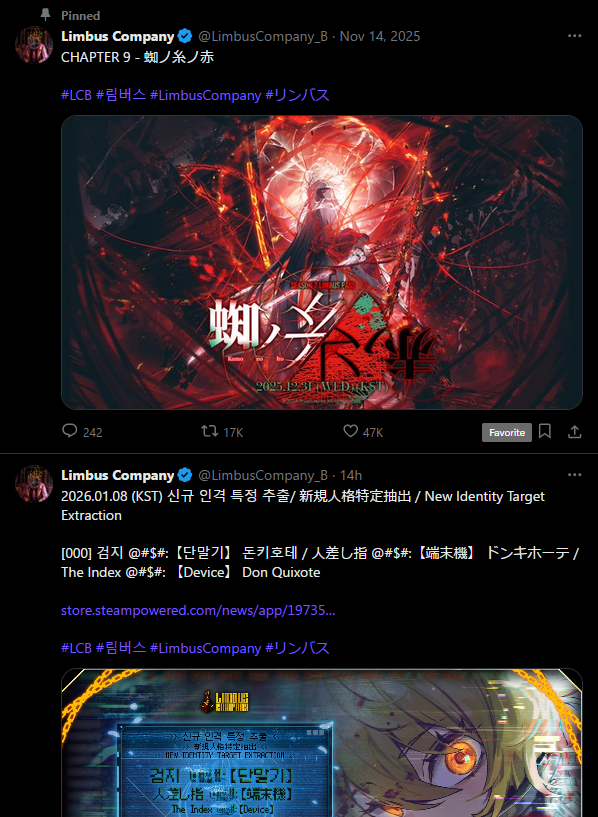 Previous thread: >>552427589Season 7 - Kumo no Ito2025.12.31 —Mirror Dungeon #6 - Mirror of Immortality2025.07.03 —Refraction Railway Line 5 - Merry Go Round2025.02.20 —>Current Events>Upcoming Extractions2026.01.08 — 2026.01.22[000] The Index @#$#: 【Device】 Don Quixote>Current Extractions2025.12.31 — 2026.01.15[000] The Index Proselyte:【Paper Slip】 Faust[000] LCA Udjat Vanguard Team 3 Leader Outis2025.12.31 — 2026.01.22Target Extraction: [ Ryoshu ] ID & E.G.O>FAQs! This game is directly tied to the setting of Project Moon's previous games, Lobotomy Corporation and Library of Ruina, and is set after both. Expect spoilers for those games in this thread.! The tutorial is important.>Download linksAppStore: https://apps.apple.com/app/limbus-company/id6444112366Google Play: https://play.google.com/store/apps/details?id=com.ProjectMoon.LimbusCompanySteam: https://store.steampowered.com/app/1973530/Limbus_Company/>Other linksOfficial twitter: https://twitter.com/limbuscompany_bOfficial youtube: https://www.youtube.com/@ProjectMoonOfficialOfficial site: https://limbuscompany.global>Required readinghttps://mega.nz/folder/xosDkZ5Z#Wt4JpUt5Bb2XG77pxuuXpw>For all your EGO and Sinner info needshttps://limbus.kusoge.xyz/https://gll-fun.com/en/>Useful resources and a general guidehttps://rentry.org/lcg_resourceshttps://rentry.org/lcbguidehttps://rentry.org/LCB_optimal_grind_guidehttps://lcb-days-since-last-id.carrd.co/https://lcb-days-since-last-ego.carrd.co/>Countdownhttps://lcbcountdown.carrd.co/
