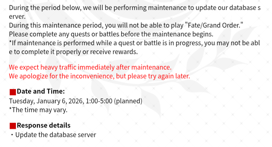 >We expect heavy traffic immediately after maintenance.>We apologize for the inconvenience, but please try again later.I guess there are some updatesOtherwise what would be "heavy traffic" for? Database is server side