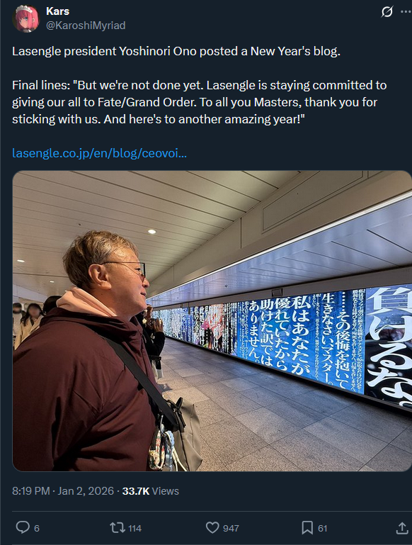Previous: >>552455481>2026 New Year's Campaign:●January 1~15 JST.▶Present: 30 SQ, 20.26M QP and a Commemorative CE.▶Login Bonus: 30 Hellfire of wisdom, 10M QP, 1 Crystallized Lore, 20 3*Fou-kun (10ATK, 10HP),10 Golden Apple, 1 Beast's Footprint, 2 5*Fou-kun (1ATK, 1HP) and 1 Holy Grail.▶Daily Fortune Bonus: 10M QP and one random material.▶Panel Missions: 5 Summon Tickets, 1 Crystallized Lore, 4.42M QP, 6 SQ, 7 Grail Tears,1 Beast's Footprint, 3 Golden Apples, a limited 3*Command Code and a commemorative CE.▶Mystic Code "Winter Casual" will have a quest rerun.▶A Stargazer's Teapot will be added to daily missions rewards (~Jan 7).▶Limited Da Vinci Shop lineup.▶Master level increased to 200.▶The chances of obtaining a great/super success when strengthening a servant/CE will be double.▶AP consumption for Ember Gathering and Training Grounds will be halved.https://news.fate-go.jp/2026/newyear2026_cp/>Scheduled maintenance for January 6, 01:00 ~ 05:00 JST.>F/GO Chaldea Satellite Station 2026, Fukui:●Saturday January 17, 17:00 JST.▶Cast: Haruki Ishiya (Beryl Gut), Ayako Kawasumi (Artoria Pendragon), Karin Takahashi (Van Gogh).https://fes.fate-go.jp/winter/>2026 New Year PU summon:●January 1~14 JST.5*Saber Lord Logres●January 3~5 JST.5*Pretender Phantasmoon4*Caster Miyu Edefelt●January 4~6 JST.5*Berserker Arjuna Alter4*Archer Aśvatthāman (story locked)●January 5~7 JST.5*Lancer Biscione4*Caster Daikokuten●January 6~8 JST.5*Archer Tutankhamun4*Caster Yui Shōsetsu●January 7~9 JST.5*Assassin Huyan Zhuo4*Avenger Xu fu●January 8~10 JST.5*Rider Takeda Shingen4*Berserker Nagakura Shinpachi●January 9~11 JST.5*Ruler Mélusine4*Archer UDK-BarghestAll limited.https://news.fate-go.jp/2026/newyear2026_pu/>/fgog/ Friendlist form and spreadsheet (2026):https://forms.gle/WK4dwSC6Mn2WQfZu8https://docs.google.com/spreadsheets/d/1leQ09m5klFajbCcededkANJfeMiAmVz-PbCI_r7xyXc/edit?usp=sharing>Utility links:https://pastebin.com/iaWmXAq7
