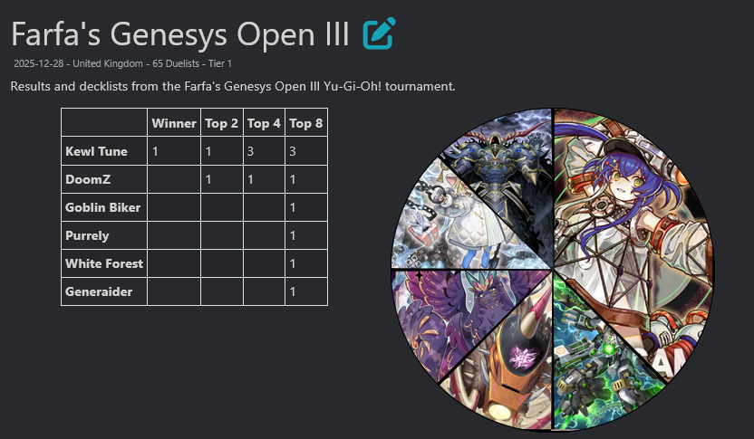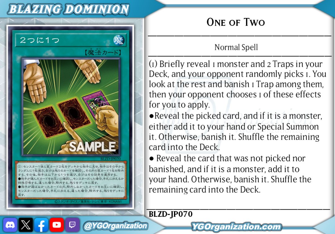 #6711 - Monty Hall editionPrevious: >>552456515>SimulatorsAutomated:●EDOPro (PC/Android): https://projectignis.github.io/download.html●Master Duel (Multi-plat): https://store.steampowered.com/app/1449850Manual:●Duelingbook (online): https://www.duelingbook.comTag: “/dng/” Password: “vidya”; on EDOPro, specify server.Genesys Duels: MR5, TCG, Custom Rules: No Links/Pend/EMZ/Pend Zones>LinksRulebook: https://www.yugioh-card.com/en/rulebook/Wiki: https://yugipedia.comProbability Calculator: https://yugioh.fyiStock Market: https://yugiohprices.comDatabase: https://www.db.yugioh-card.comMisc Info: https://www.formatlibrary.comBlog:https://yugiohblog.konami.com/Alt Format:https://www.yugioh-card.com/en/genesys/>BanlistsTCG: https://www.yugioh-card.com/eu/play/forbidden-and-limited-list/ (Oct 27/Next List: TBA)OCG: https://yu-gi-oh.jp/news_detail.php?page=details&id=2406 (Jan 1/Next List: April 1)>DecklistsOCG: https://roadoftheking.com https://tonamel.com/competitions?game=yugioh_ocgTCG: https://ygoprodeck.com/category/decks/tournament-meta-decks>NewsJP: https://yugioh-starlight.comEN: https://ygorganization.com>Upcoming SetsOCG:●THE CHRONICLES DECK - Charmer (Jan 24)●Blazing Dominion (Jan 24)●Deck Build Pack: Cosmic Rivals (Feb 26)●LIMIT OVER COLLECTION -THE PROTAGONISTS- (Feb 28)●LIMIT OVER COLLECTION -THE RIVALS- (Mar 20)●Chaos Origin (Apr 25)TCG:●Burst Protocol (Jan 23)●THE CHRONICLES DECK - Spirit Charmers (Jan 23)●Maze of Muertos (Feb 20)●Legendary Modern Decks 2026 (Mar 13)●Rarity Collection 5 (Apr 10)>Events●/dng/ League S1 (Week 18, Dec 29-Jan 5):https://challonge.com/dngleagueseason1