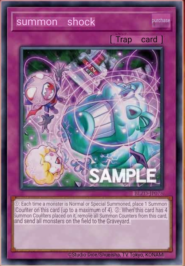 >>552705292このカード名のカードは1ターンに1度しか発動できない。以下の効果を3回適用する。お互いに攻撃力?以外のモンスターを選びお互いに確認する。攻撃力が高い方のモンスターはそのカードを選んだプレイヤーの手札に加える。攻撃力が低い方のモンスターは破壊され、そのカードを選んだプレイヤーは500ポイントダメージを受ける。攻撃力が同じ場合はデッキに戻す。このターン、お互いに選んだモンスター及びその同名モンスターのモンスター効果を発動できない。You can only activate 1 card with this card's name per turn.(1) Apply the following effect 3 times.*Each player reveals 1 monster in their Deck, except those with ? ATK. The player who revealed a monster with the higher ATK adds it to their hand, also the player who revealed a monster with the lower ATK destroys it, and if they do, they take 500 damage. If the ATK are tied, shuffle them into the Deck. For the rest of this turn, neither player can activate the effects of the chosen monsters and monsters with the same name.