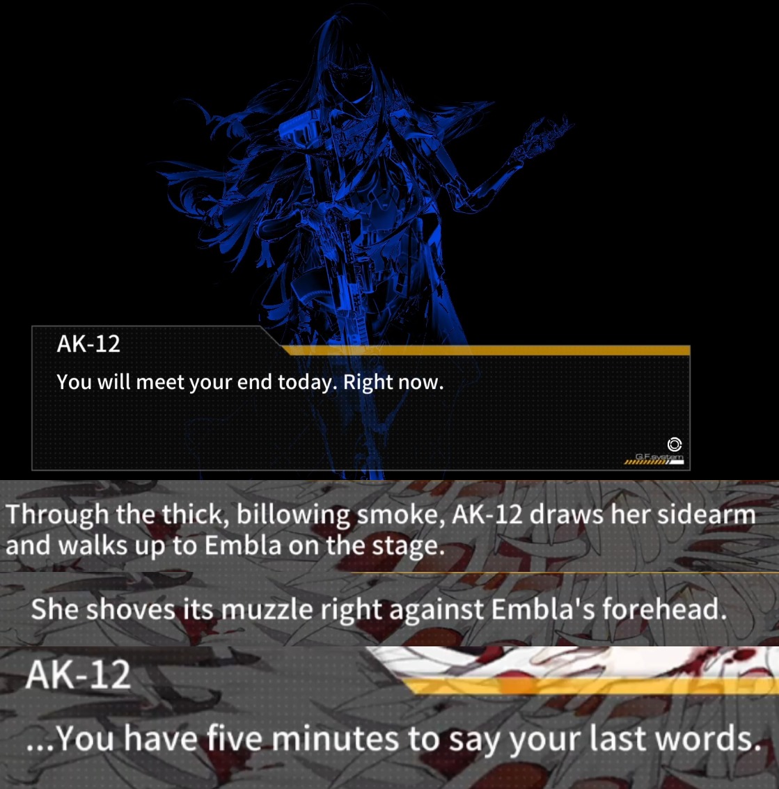 >>552761381>properlyWell, whoever that Doll is decided to explicitly avoid vital injuries to SOP and Kalina, so a brutal death may still be in the cards but based on her actions it wouldn't exactly be "proper" to go out that way.>playableI really won't be surprised if that Doll perishes and the Groza on Elmo simply gets the data and other upgrades from her. A tad like how SF tech was used to create Shotguns IIRC. Speaking of which I wonder where pic-related is.