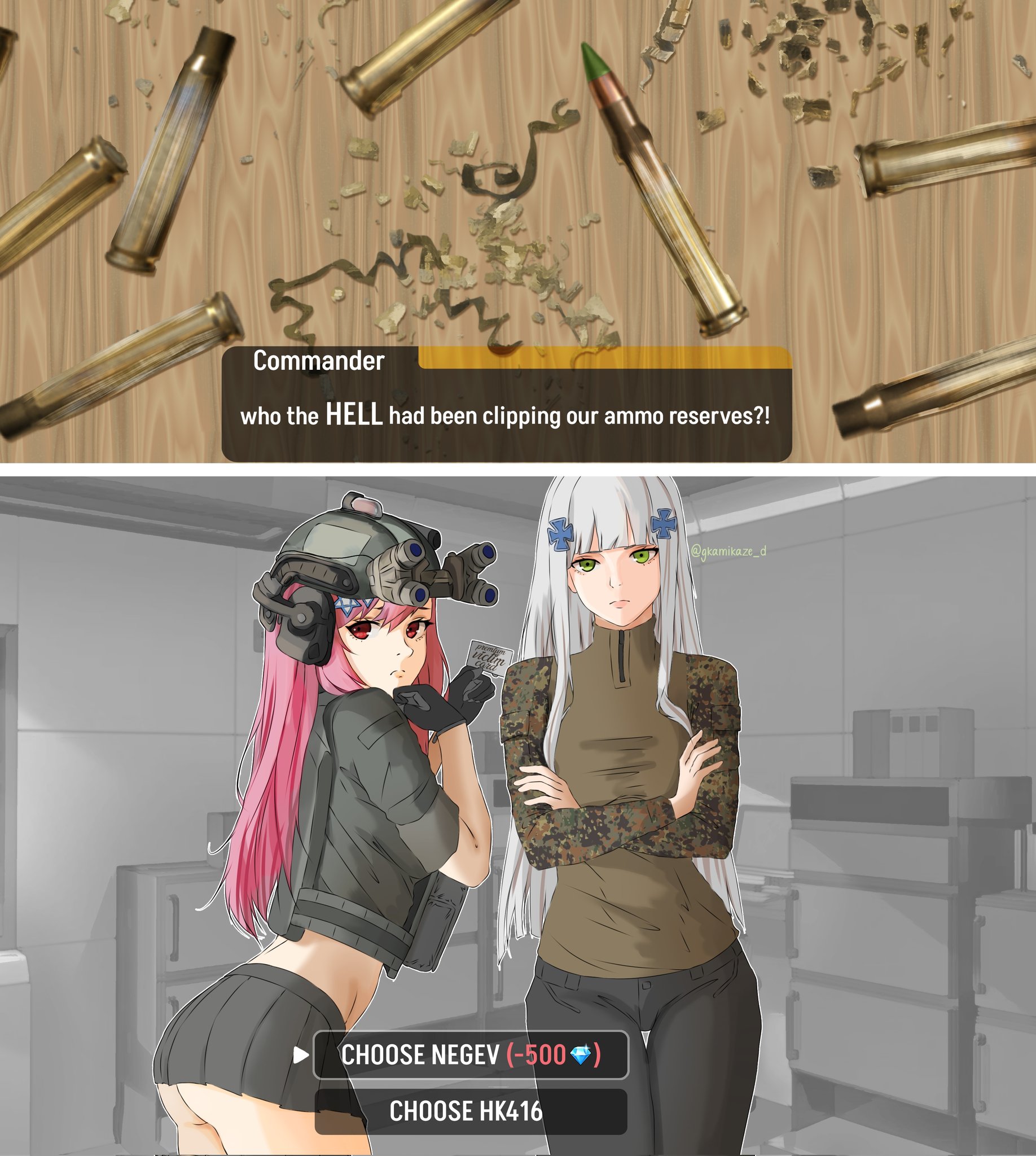 >>552762314>I really won't be surprised if that Doll perishes and the Groza on Elmo simply gets the data and other upgrades from her. A tad like how SF tech was used to create Shotguns IIRC. Speaking of which I wonder where pic-related is.While that would be a satisfactory conclusion story-wise, it would set a bad precedent meta-wise since it'd open the doors for completely nonsensical alters. If NeGro remains a separate entity, it would at least make narrative sense to have her as a distinct unit fieldable alongside normal Groza. If she'll become an upgrade package for Groza, not so much.