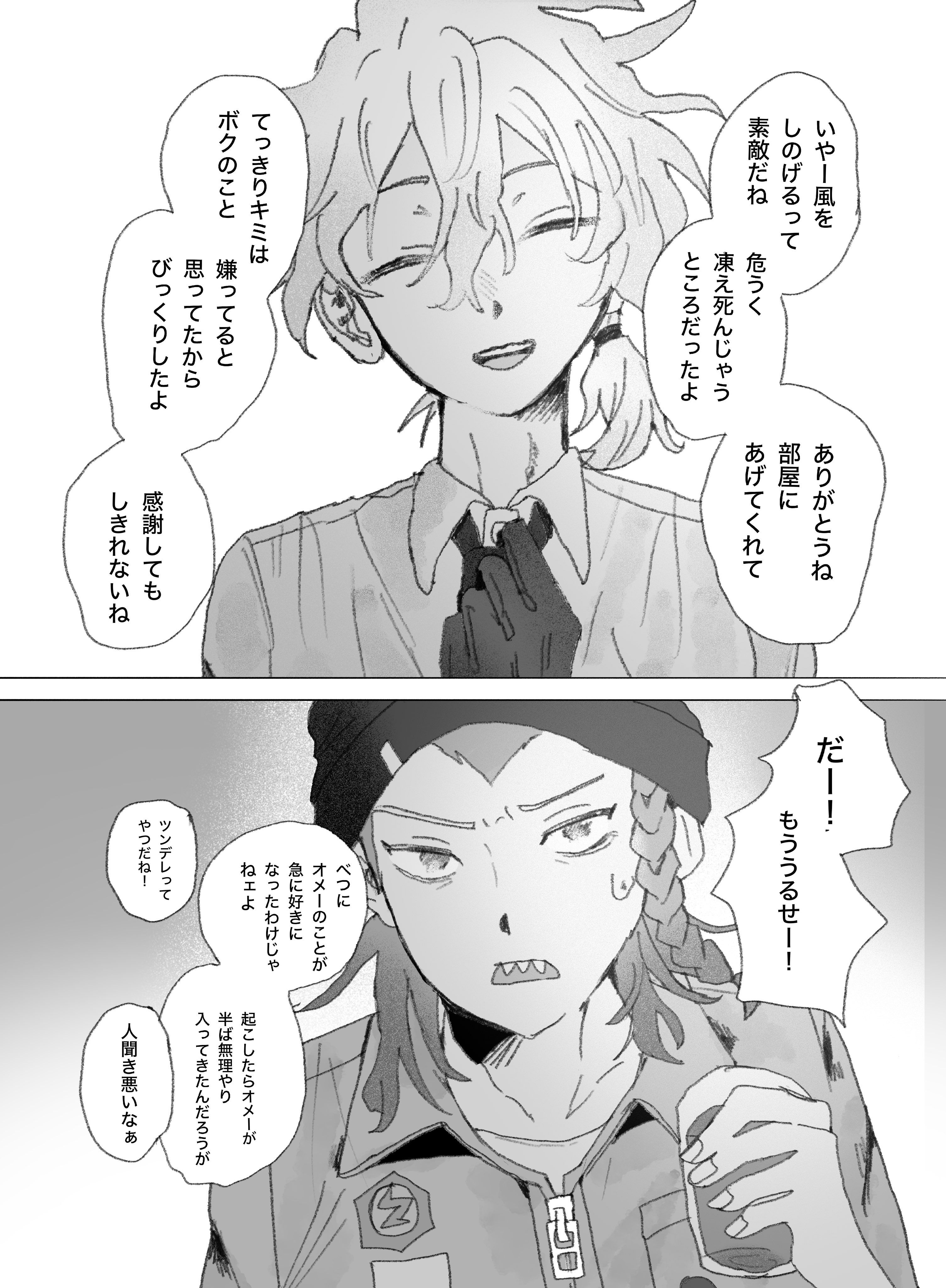 Ah, being able to get out of the wind is wonderful. I was on the verge of freezing to death. Thanks for letting me into your room. I thought for sure you hated me, so I was surprised. I can't thank you enough.GAAHH--! Shut up already--!It's not like I suddenly started liking you or anything. (Such a tsundere!)You woke me up, and you practically forced your way inside. (That makes me sound bad.)