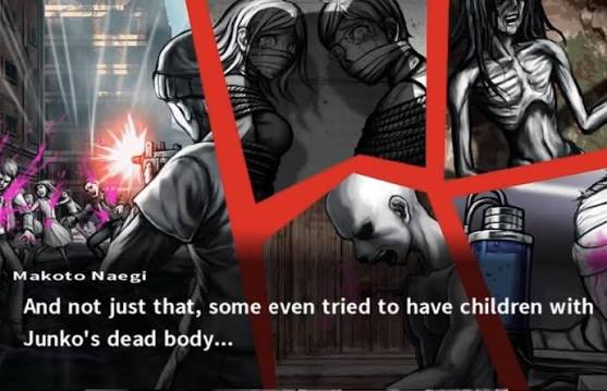 >Chapter 2: Glitch in the System>Motive: The Secret History. Monokuma distributes "Dossiers" containing the embarrassing internet search histories and real-life identities of the participants.>The Victim: Chiakifag. Found dead in the Arcade Room, crushed under a spilled cabinet of retro games.>The Situation: Chiakifag and Soudafag were arguing over who was the "truer" fan of mechanics and gaming.>The Trick: A locked-room mystery. The door was blocked from the inside by the cabinet. The killer used a complex system of pulleys and wires (using the internal wiring of an arcade machine) to tip the cabinet from the outside after the victim was lured in.>The Killer: Soudafag.>The Motive: Jealousy and Paranoia. >Soudafag believed Chiakifag was going to leak his dossier (which revealed he wasn't actually a mechanic, just a poser).>Execution: “Tune Up.” Soudafag is strapped to a conveyor belt leading into a giant engine. Robotic arms strip him of his clothes and replace them with car parts, bolting them directly into his skin, before he is fed into the combustion chamber.