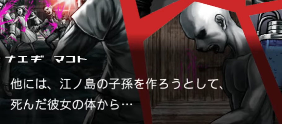 >Chapter 3: Magic and Misery>Motive: The Despair Disease. A digital virus infects the participants, inverting their personalities.>The Victims: Himikofag and Oumenofag.>Himikofag is found drowned in the pool (illusion trick).>Oumenofag is found stabbed in the warehouse hours later.>The Situation: The classic double murder. The killer took advantage of the "Despair Disease" chaos.>The Trick: The killer created a "magic show" setup. They used dry ice to obscure the pool (killing Himikofag). They then transported Oumenofag (who was witnessing the act) to the warehouse, framing it as a murder-suicide pact between the two "magic" enthusiasts.>The Killer: Ryonafag.>The Motive: Pure Sadism. The disease didn't invert Ryonafag’s personality; it amplified it. He wanted to see the "hope" of the magic duo crushed.>Execution: “The Iron Maiden’s Embrace.” Ryonafag is placed inside a torture dungeon. He is subjected to a gauntlet of cartoonish but lethal traps, finally ending in a spiked coffin that closes slowly while the remaining students watch.
