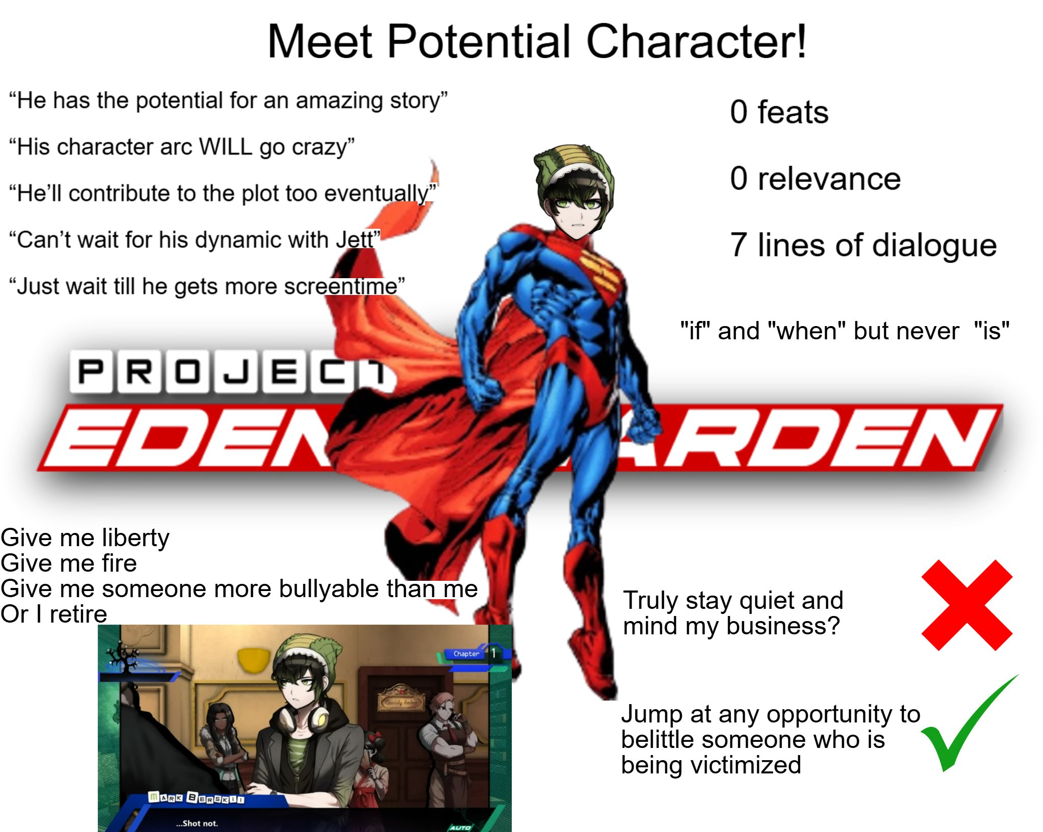 >Chapter 6: The End of the Thread>The Survivors:>ChiakiESL (Protagonist)>Impostorfag>Chihirofag>Kamukun>Drydick>The Investigation:>The survivors unlock the Mastermind's control room. They discover that the "Ultimate Echo Chamber" is a simulation. They are actually just avatars in a dying forum thread.>The Mastermind: Drydick.>Reason: Absolute Nihilism. Drydick was bored with the "fandom" and wanted to destroy it from the inside to prove that "hope" is just a cope. He controlled Monokuma to purge the "cringe" users.>The Final Showdown:>Kamukun (who has been bored and neutral the whole time) finally awakens her "Ultimate Talent." She realizes that even if this is a simulation, the boredom of doing nothing is worse than the struggle for survival.>Chihirofag hacks the simulation's source code, creating a path to the "Admin Privileges.">ChiakiESL leads the debate, dismantling Drydick's logic of apathy.>The Ending:>The survivors vote to "Delete the Thread" (destroy the simulation) rather than stay in the endless loop or graduate to a void.>Drydick is executed: “404 Not Found.” He is pixelated and deleted file by file, screaming as he is erased from existence.>The Survivors:>ChiakiESL, Impostorfag, Chihirofag