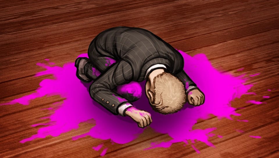 >Chapter 5: The Unidentifiable Victim>Motive: The Traitor’s Key. Monokuma reveals one person is working for the mastermind.>The Victim: Kaitofag. (Or so it seems).>The Situation: A body is found in the Hydraulic Press (a callback to V3), crushed beyond recognition. The exisal/mech suit is active.>The Trick: Amasaifag (the Ultimate Detective fan) and Kaitofag worked together to create a murder that Monokuma couldn't solve to break the game. They swapped clothes and used video loops. The victim was actually Amasaifag, who sacrificed himself.>The Killer: Kaitofag (unwillingly/assisted suicide).>The Twist: The class votes for Kaitofag as the victim, assuming Amasaifag is the killer. However, Amasaifag is the victim. Kaitofag is the killer. But because the plan failed to trick Monokuma, Kaitofag is executed.>Execution: “Blast Off.” Kaitofag is put in a rocket that fails to launch, exploding on the pad.