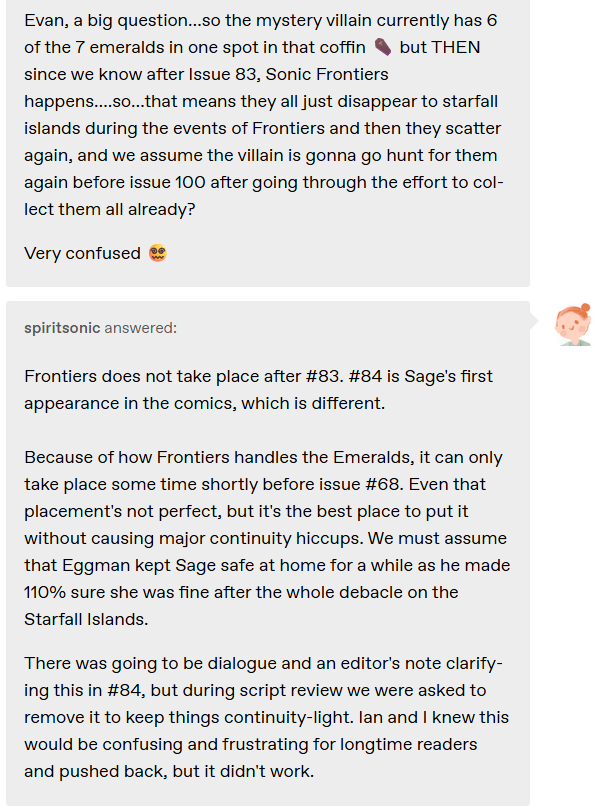 If Yuji Naka wanted to he could have stated that Sonic doesn't want relationships in actual writing instead of some vague "uh he's like the wind and is always free" shit. You don't see him actually put a verbal stamp on that until 2004 and the western side wouldn't be punished for doing it until 2011