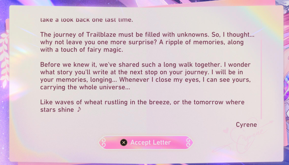 >All these years I've been waiting for you~>All this time, I've been thinking about you>Caelus: And Phainon?>Cyrene: Fufufu~>33 million lives well spent~