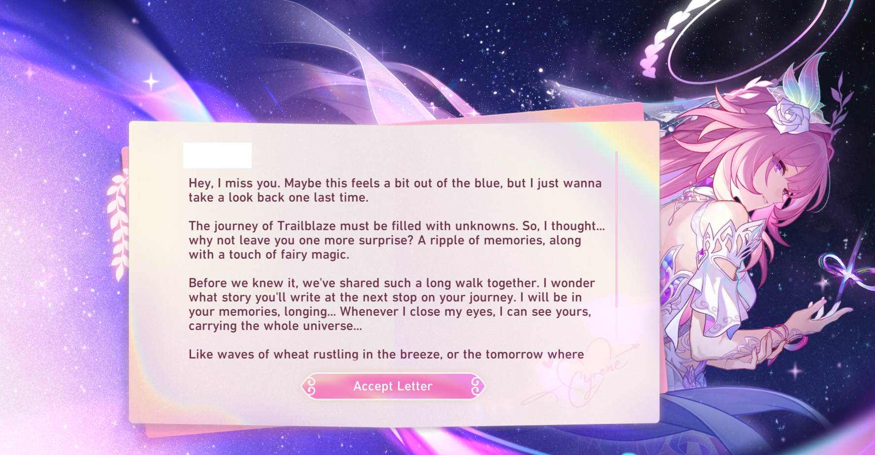 >>552750161>Goodbye, Trianne>Goodbye, Anaxa>Goodbye, Castorice>Goodbye, Aglaea>It's a date, Mydeimos >Goodbye, Cyrene