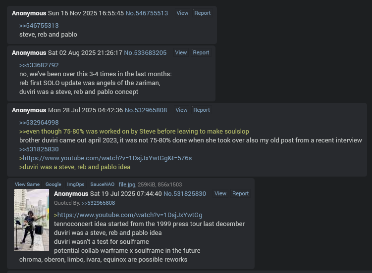 >Soulframe flops>DE has to do layoffs>Steve and fat fuck back on the WF dev teamWe can't let this happen. We unironically have to play SF.