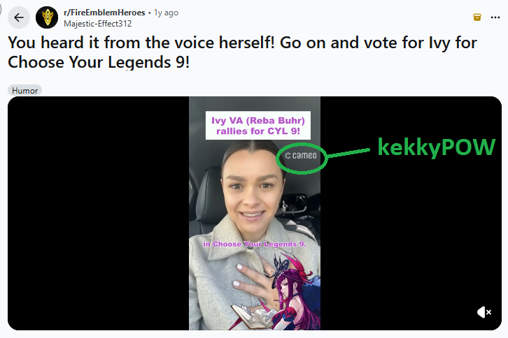 >>552764298>Or the VA actively shilling her character for the entire week like Baldr?They actually did do this, but they had to pay Ivy's VA to do it via Cameo because she doesn't give a fuck about Ivy or Engage.