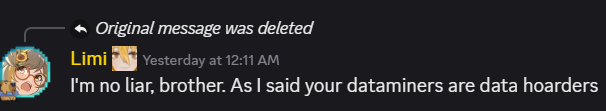 >>552799327>>552799587Maybe they are coping that its due to it allegedly being a leak and not a datamine? I could see discord cuck admins not allowing leaks