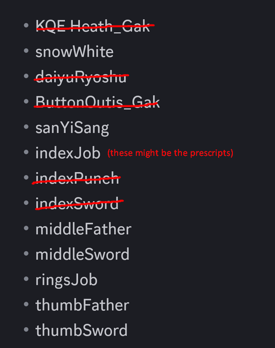>>552800392snowWhite was Ebony Queen's Apple. ThumbFather and ThumbSword both were shown in part 1. RingsJob was shown in part 1 if its their weird ass robot machine things.So its just sanYiSang, indexJob, middleFather, middleSword left.