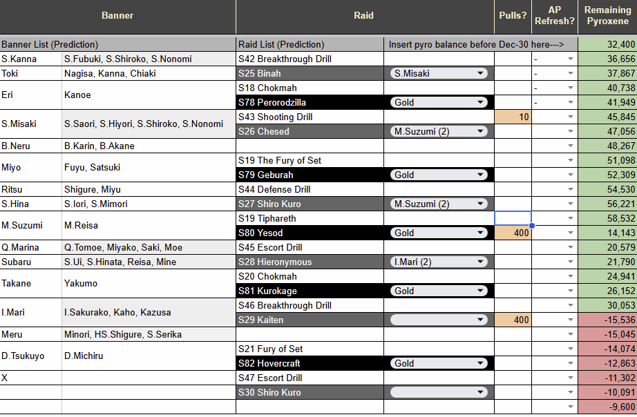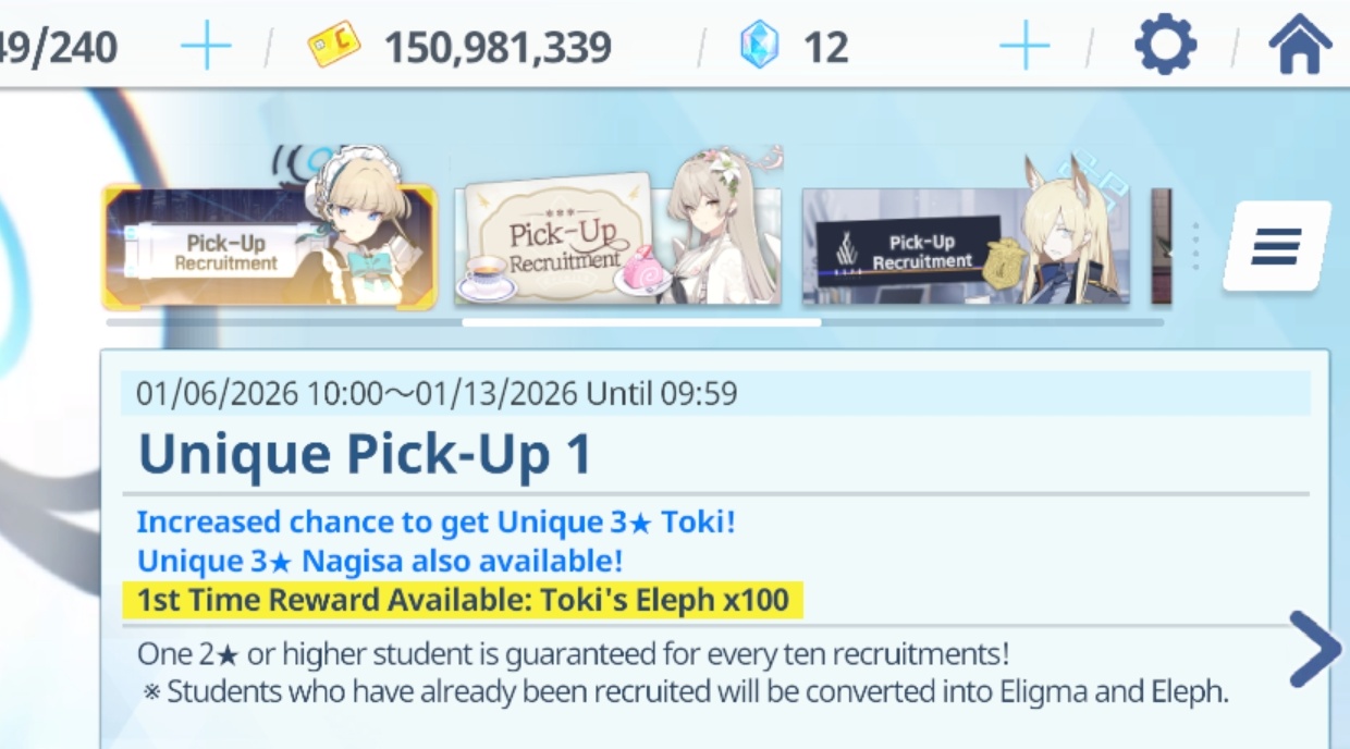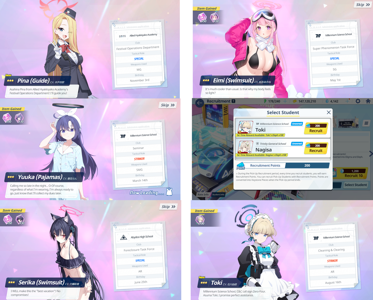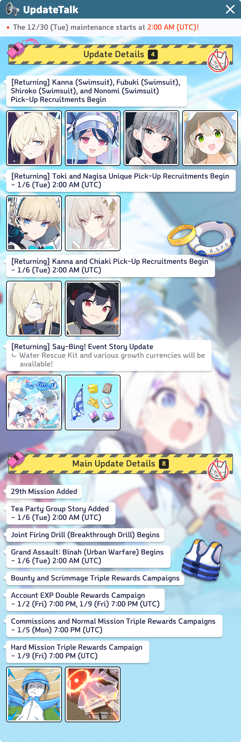 Previous Thread: >>552796634>Guides, Resources and useful links:https://rentry.org/bagguides>/bag/Circles/Clubs/Friends:https://rentry.org/holdingthebag>4koma, Manga, Side Content, PVs & Shortshttps://rentry.org/bacontent>>(JP) – JST>Banners:>12/24 After Maint – 1/7 10:59Tsukuyo (Dress)Michiru (Dress)>News:5th Anniversary Website: https://5th-anniversary.bluearchive.jpPatch notes: https://bluearchive.jp/news/newsJump/614>Events:An Unconcealed Path: Fashion Show Escort Mission! – 12/24 After Maint – 1/7 10:59The Senses Descend – 1/7 After Maint – 1/14 3:59>Content:Total Assault: Hovercraft (Field) – 12/31 11:00 – 1/7 3:59Joint Firing Drill (Escort) – 1/7 After Maint – 1/14 3:59Grand Assault: ShiroKuro (Urban – Torment w/Special & Elastic Armor) – 1/14 11:00 – 1/20 3:59Limit Break Assault: The Fury of Set (Field – w/Light Armor) – 12/25 11:00 – 1/20 3:592x Normal/Lesson – 12/31 4:00 – 1/7 3:592x Account EXP – 1/3 4:00 – 1/5 3:592x Hard – 1/7 4:00 – 1/14 3:592x Scrimmage/Commission – 1/14 4:00 – 1/20 3:59>>(GLOBAL) – UTC>Banners:>1/6 2:00 – 1/13 1:59Toki (Limited)Nagisa (Limited)KannaChiaki>News:Patch notes: https://forum.nexon.com/bluearchive-en/board_view?thread=3317296>Events:My Office: https://bluearchive.nexon.com/user/myoffice>Content:Grand Assault: Binah (Urban – Torment w/Elastic Armor) – 1/6 2:00 – 1/12 18:59Limit Break Assault: Tiphareth (Indoor – w/Heavy Armor) – 12/17 2:00 – 1/12 18:593x Commissions – 1/5 19:00 – 1/12 18:593x Normal – 1/5 19:00 – 1/9 18:592x Account EXP – 1/9 19:00 – 1/11 18:593x Hard – 1/9 19:00 – 1/12 18:592x Bounty – 1/12 19:00 – 1/19 18:592x Account EXP – 1/16 19:00 – 1/18 18:59