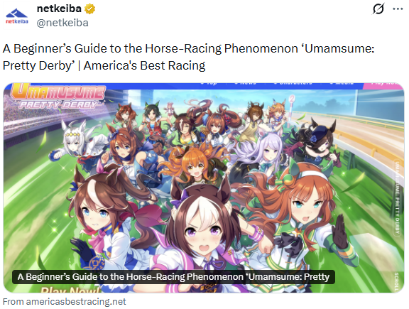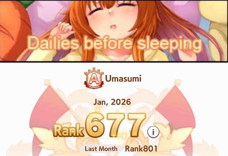 Previous: >>552804801>Global Game NewsLink your account to Cygames iDCurrent Scenario: Aoharu Hai aka "Unity Cup"Current CM: Scorpio Cup - Tokyo Turf 2000mCurrent Rate Up Trainee: Oguri Cap (3* alt), Biwa Hayahide (3* alt), Mejiro Dober 3*Current Rate Up Support Cards: Narita Taishin (SSR), Mayano Top Gun (SSR), Daitaku Helios (SSR), Vodka (SR)Late January - Sagittarius Cup - Nakayama Turf 2500mhttps://umamusume.com/news/100040/https://pages.snep.pw/uma/anni-skill-changes/>JP Game NewsCurrent Rate Up: NY Sakura Laurel 3*, NY Ikuno Dictus 3*, Oguri Cap 3* (Forma de Cinderella), Stay Gold 3*, Air Groove (Speed SSR), Fine Motion (Power SSR) Inari One (SSR), Mejiro Dober (SR)New Scenario "Yukoma Hot Spring" releasedTimeline: https://uma.moe/timelineCygames Webstore: https://webstore.cygames.com/en/umamusume_en/>Thread Clubshttps://rentry.co/umaglobalclublistYou must be E3 (20k points) to join a circle. Apply with /uma/ or /vg/ in your profile or post ID in the thread.>All Guides & Resourceshttps://rentry.org/uma26Game databasehttps://gametora.com/umamusume (Click the gear to switch between JP / global server info)A basic guide for newfagshttps://rentry.org/umaglobalFind networks if your region is blocked from the game or clienthttps://www.umavpn.top/93Seiyuu & Concertshttps://rentry.org/umstUma Texthttps://umareader.idsmile.xyz/
