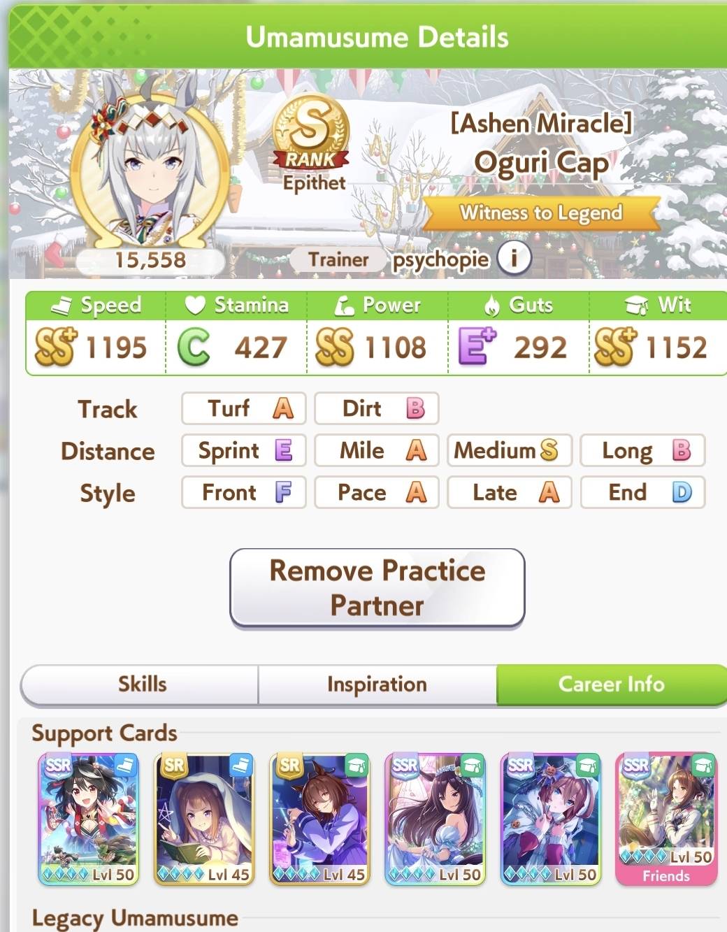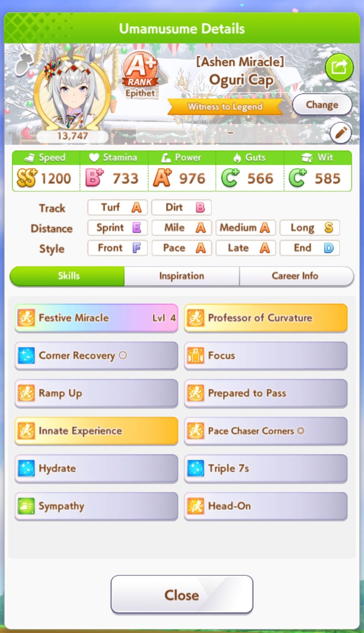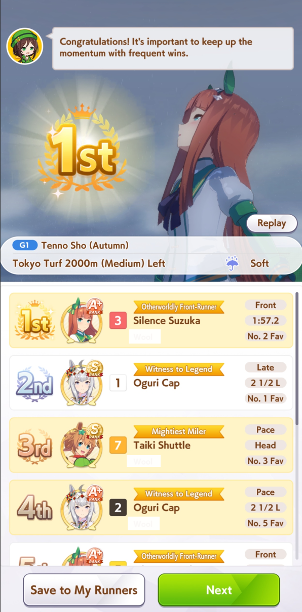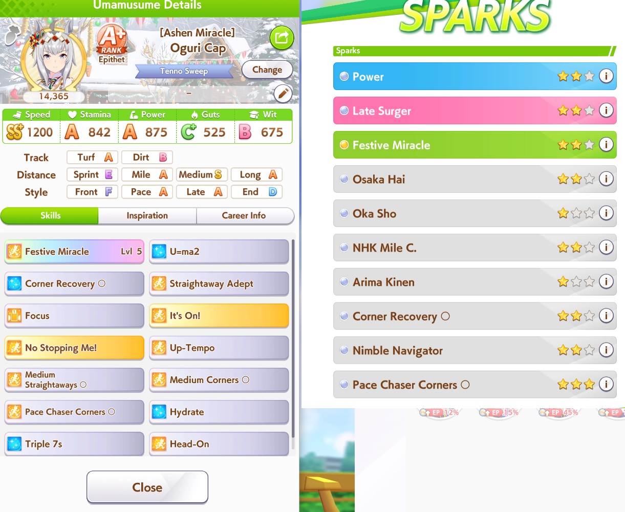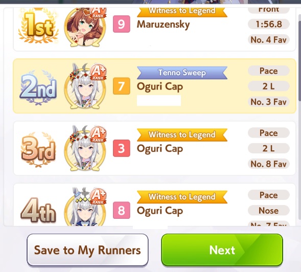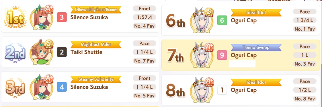 >>552836056Well. At least Small Breather gets buffed to be mid-race down the line. But just beware for future CM's that you really need to have sparks planned and ready for non-Pace XOguri. CM8 is United Spirit STA and After-School Stroll.