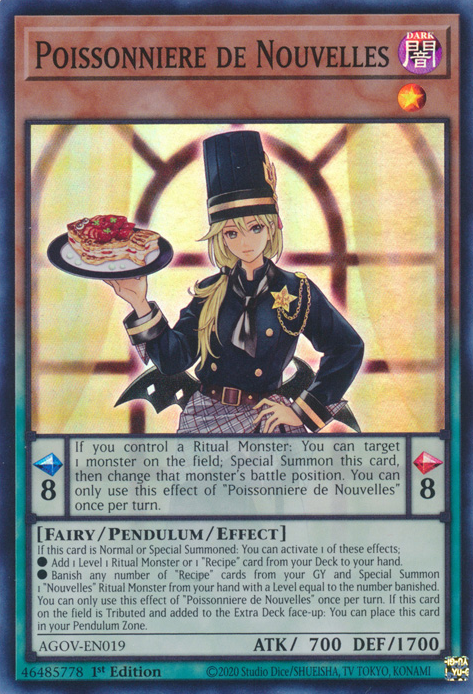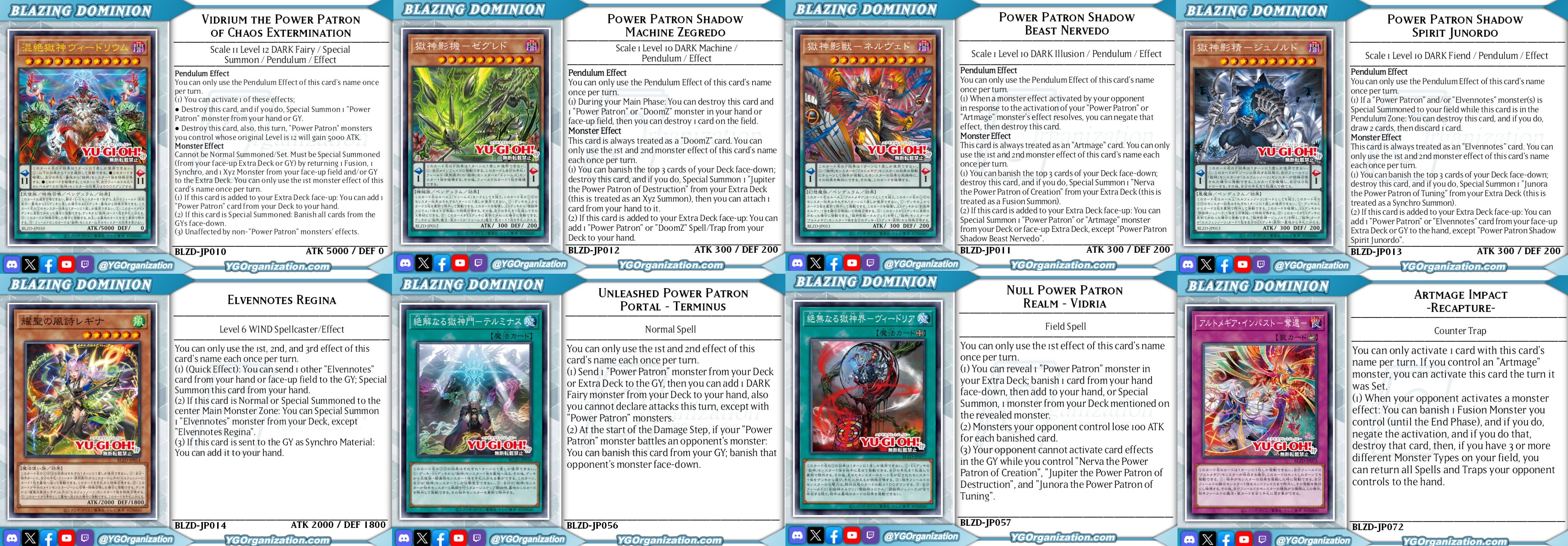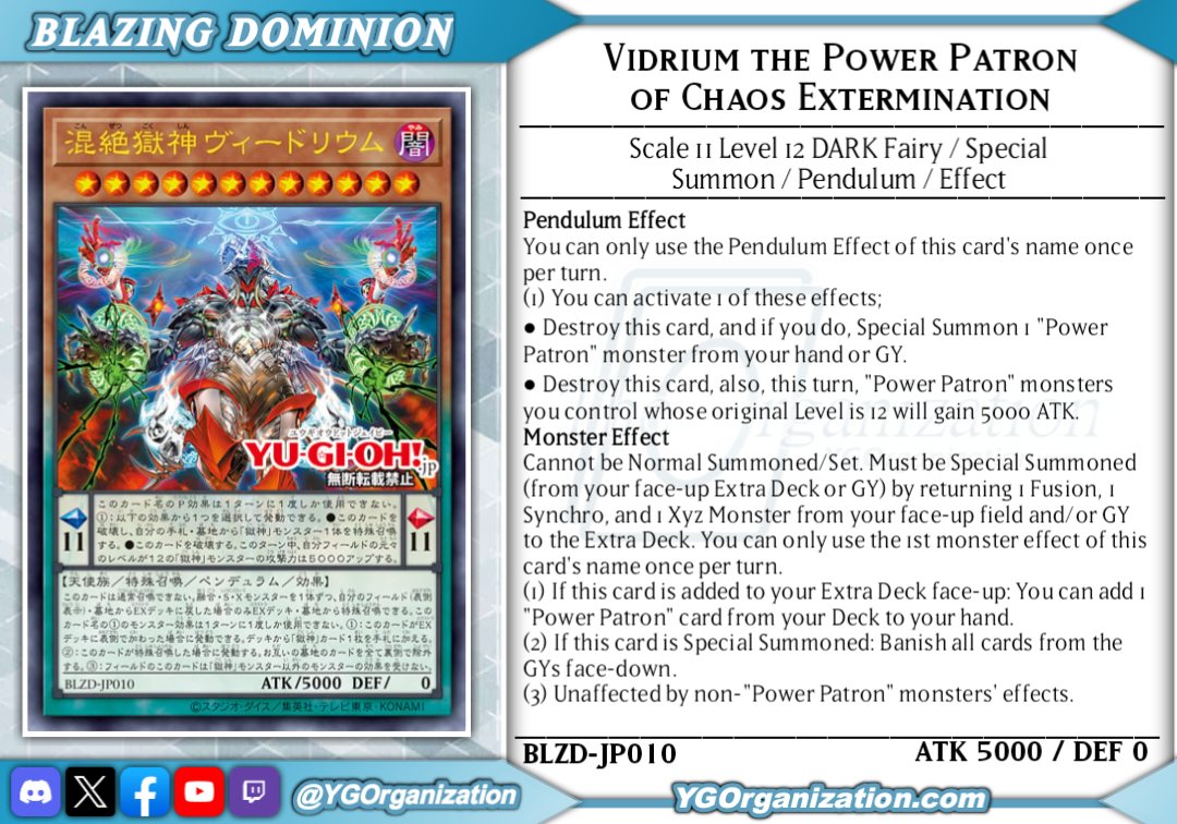 Vidrium, Power Patron of ExterminationDARK Level 12 Fairy Special Summon Pendulum Effect Monster5000 ATK / 0 DEF | Scales: 11/11-PENDULUM TEXT -You can only use the Pendulum Effect of this card's name once per turn.(1) You can activate 1 of these effects; -Trigger-like-*Destroy this card, and if you do, Special Summon 1 "Power Patron" monster from your hand or GY.*Destroy this card, also for the rest of this turn, your "Power Patron" monsters whose original Level is 12 will gain 5000 ATK.-MONSTER TEXT-Cannot be Normal Summoned/Set. Must be Special Summoned (from your Extra Deck or GY) by shuffling into the Extra Deck 3 monsters (1 Fusion 1 Synchro, and 1 Xyz) from your GY or face-up field.You can only use the following monster effect (1) from this card's name once per turn.(1) If this card is added to the Extra Deck face-up: You can add 1 "Power Patron" monster from your Deck to your hand. -Trigger.-(2) if this card is Special Summoned: Banish all cards in the GYs (or as many as possible), face-down. -Trigger, Mandatory.-(3) This card on the field is unaffected by monster effects, except "Power Patron" monsters. -Continuous.-