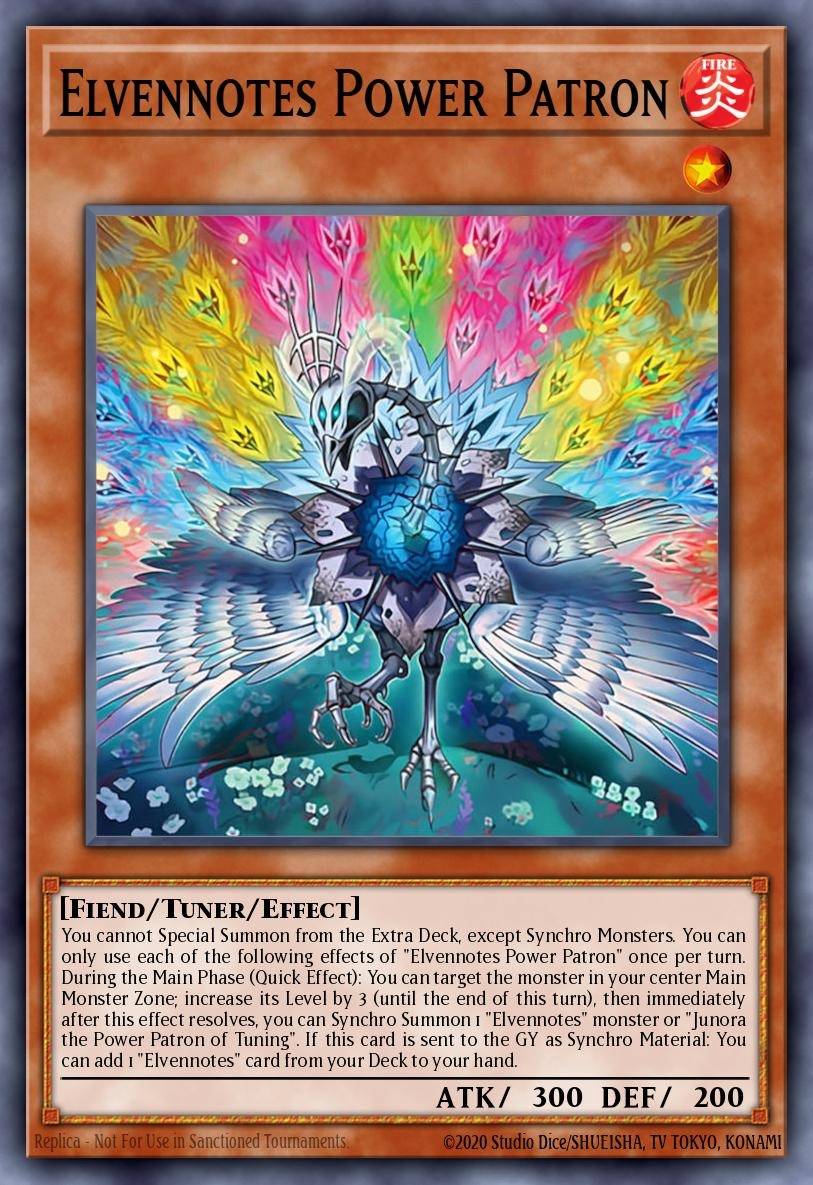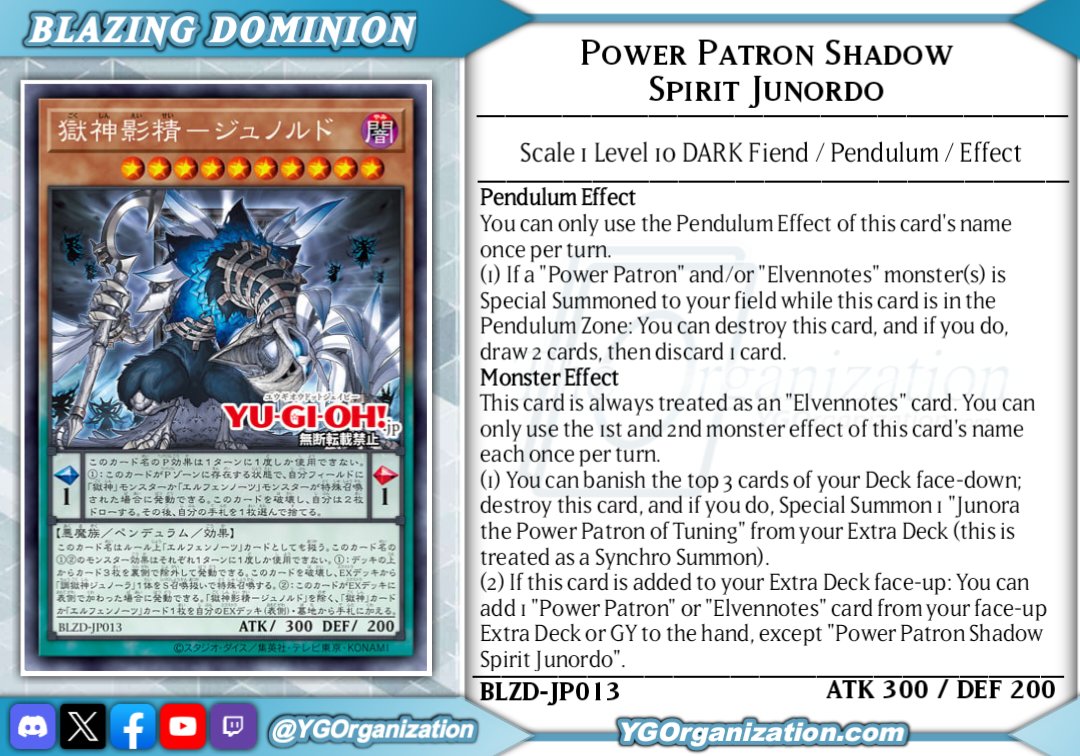 Junord, Power Patron of Shadow SpiritsDARK Level 10 Fiend Pendulum Effect Monster300 ATK / 200 DEF | Scales: 1/1-PENDULUM TEXT -You can only use the Pendulum Effect of this card's name once per turn.(1) If a "Power Patron" or "Elfnotes" is Special Summoned to your field, while this card is in the Pendulum Zone: You can destroy this card, and if you do, draw 2 cards, then discard 1 card.-MONSTER TEXT-(This is always treated as an "Elfnotes" card.)You can only use the following monster effects, (1) & (2), from this card's name once per turn.(1) You can banish face-down the 3 topmost cards from your Deck; destroy this card, and if you do, Special Summon 1 "Junora, Power Patron of Tuning" from your Extra Deck (this is treated as a Synchro Summon). -Ignition.-(2) if this card is added to the Extra Deck face-up: You can add 1 "Power Patron" or "Elfnotes" card from your face-up Extra Deck or GY to your hand, except "Junord, Power Patron of Shadow Spirits". -Trigger.-