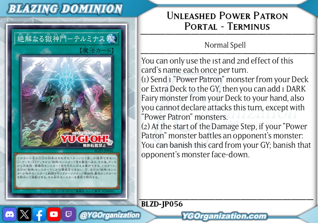 Nihilistic Power Patron Gate - TerminusNormal SpellYou can only use the (1) and (2) effects of cards with this card's name once per turn.(1) Send 1 "Power Patron" monster from your Deck/Extra Deck to the GY, then you can add 1 DARK Fairy monster from your Deck to your hand, also for the rest of this turn, you cannot declare attacks, except with "Power Patron" monsters.(2) At the start of the Damage Step, when your "Power Patron" monster battles your opponent's monster: You can banish this card from your GY; banish that opponent's monster face-down.