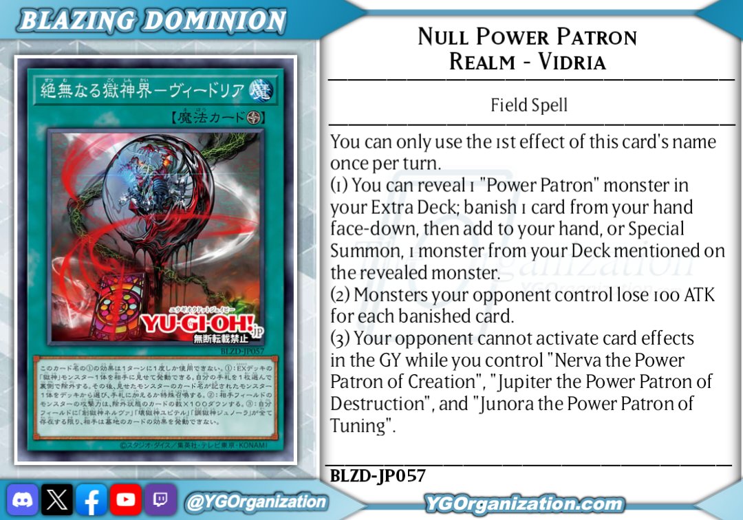 Nihilistic Power Patron Realm - VidriaField SpellYou can only use the (1) effect of cards with this card's name once per turn.(1) Reveal 1 "Power Patron" monster in your Extra Deck; banish face-down 1 card from your hand, then add to your hand, or Special Summon, 1 monster from your Deck that is mentioned on the revealed monster.(2) Monsters your opponent controls lose 100 ATK for each banished card.(3) While you control "Nerva the Power Patron of Creation", "Jupiter the Power Patron of Destruction" and "Junora the Power Patron of Tuning", your opponent cannot activate the effects of cards in the GY.