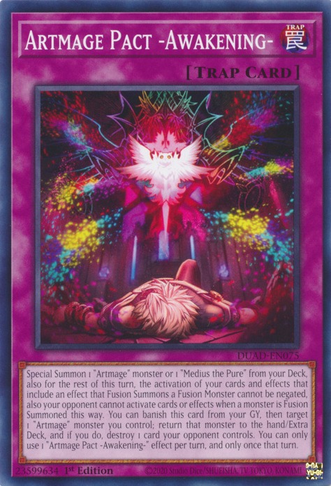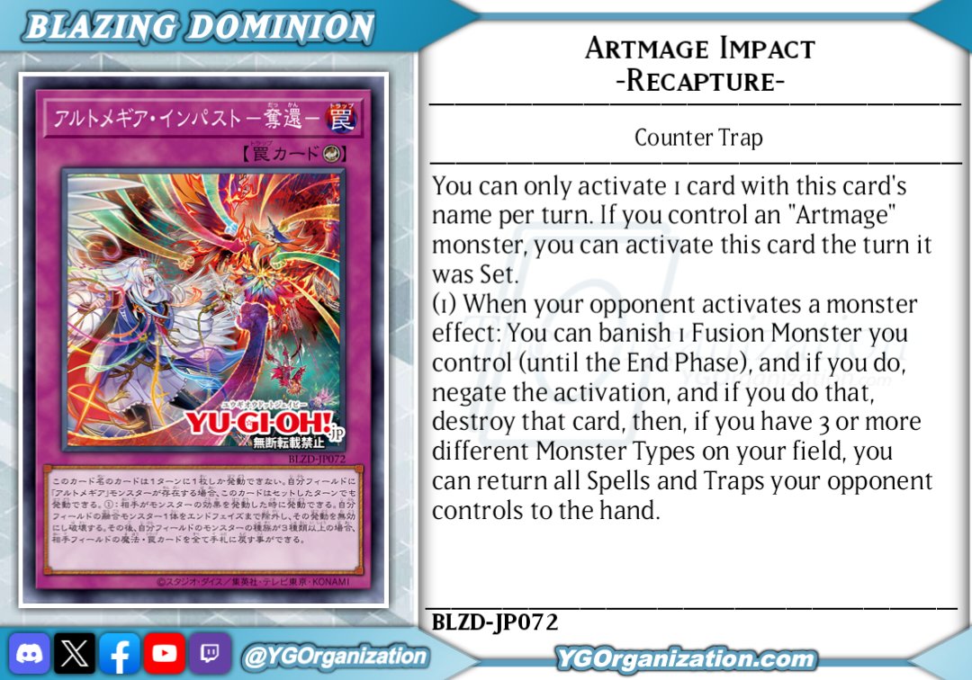 Counter TrapYou can only activate 1 card with this card's name per turn. If you control an "Artmage" monster, you can activate this card even on the turn it was Set. 1: When your opponent activates a monster effect: You can banish 1 Fusion Monster you control until the End Phase, negate the activation, and destroy it. Afterwards, if you control 3 or more monsters of different types, you can return all Spell and Trap Cards on your opponent's field to their hand.