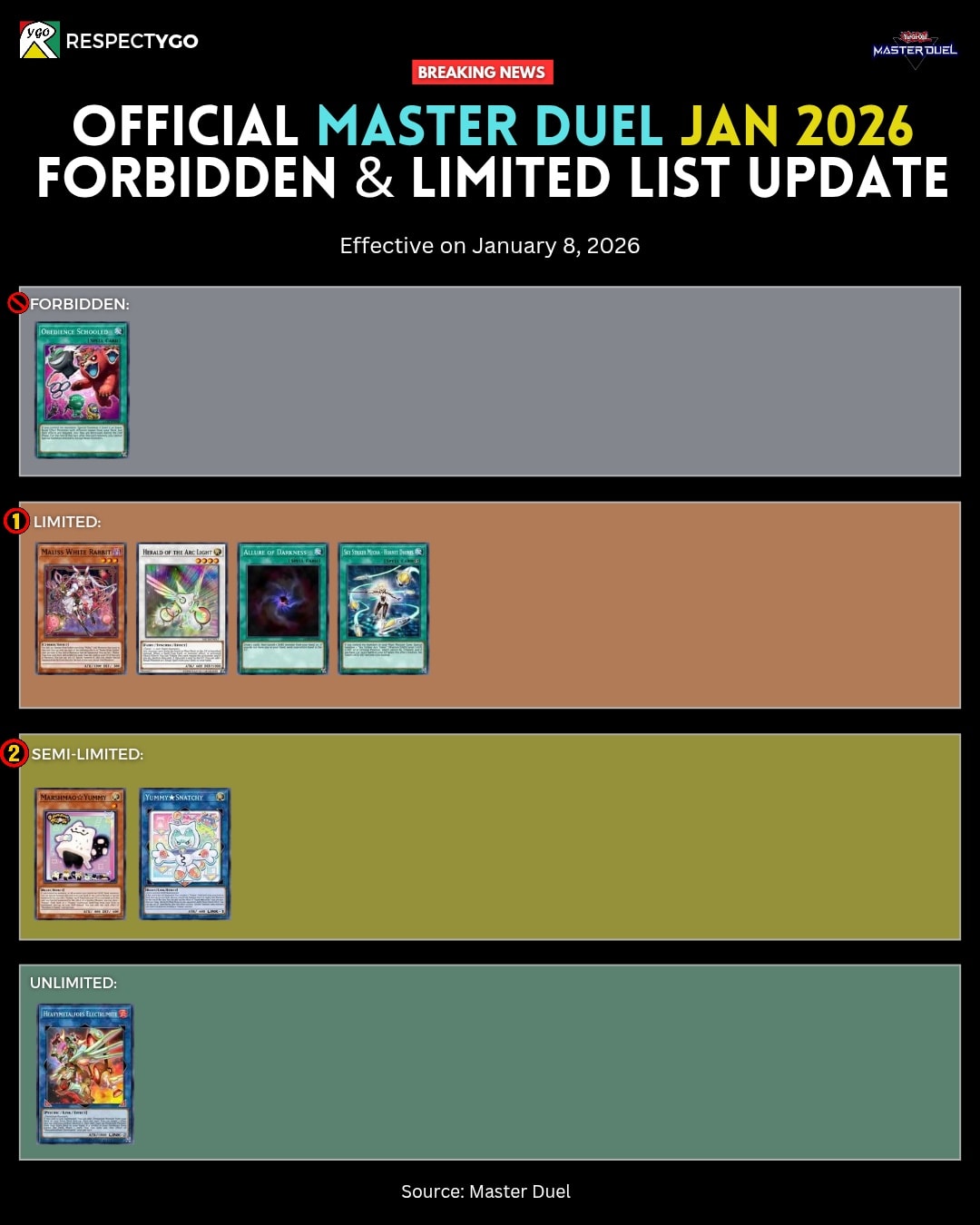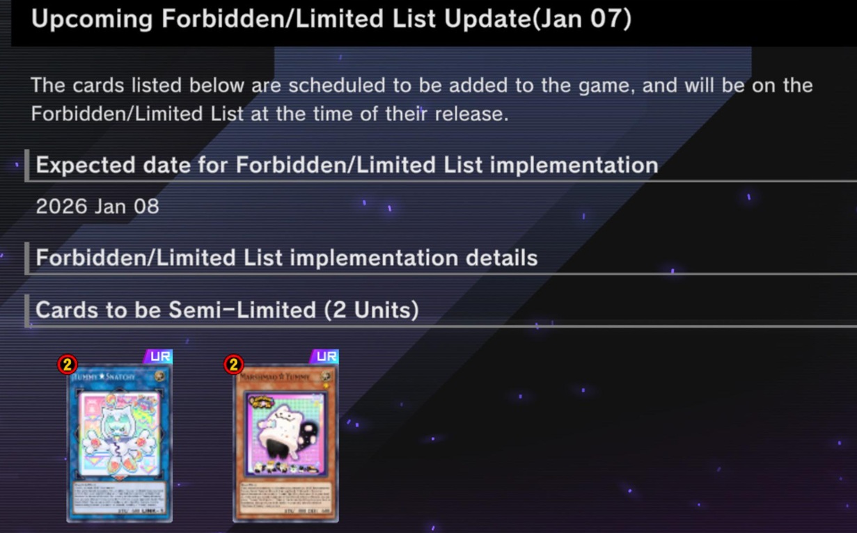 #6713 - They're pends now editionPrevious: >>552724120>SimulatorsAutomated:●EDOPro (PC/Android): https://projectignis.github.io/download.html●Master Duel (Multi-plat): https://store.steampowered.com/app/1449850Manual:●Duelingbook (online): https://www.duelingbook.comTag: “/dng/” Password: “vidya”; on EDOPro, specify server.Genesys Duels: MR5, TCG, Custom Rules: No Links/Pend/EMZ/Pend Zones>LinksRulebook: https://www.yugioh-card.com/en/rulebook/Wiki: https://yugipedia.comProbability Calculator: https://yugioh.fyiStock Market: https://yugiohprices.comDatabase: https://www.db.yugioh-card.comMisc Info: https://www.formatlibrary.comBlog:https://yugiohblog.konami.com/Alt Format:https://www.yugioh-card.com/en/genesys/>BanlistsTCG: https://www.yugioh-card.com/eu/play/forbidden-and-limited-list/ (Oct 27/Next List: TBA)OCG: https://yu-gi-oh.jp/news_detail.php?page=details&id=2406 (Jan 1/Next List: April 1)>DecklistsOCG: https://roadoftheking.com https://tonamel.com/competitions?game=yugioh_ocgTCG: https://ygoprodeck.com/category/decks/tournament-meta-decks>NewsJP: https://yugioh-starlight.comEN: https://ygorganization.com>Upcoming SetsOCG:●THE CHRONICLES DECK - Charmer (Jan 24)●Blazing Dominion (Jan 24)●Deck Build Pack: Cosmic Rivals (Feb 26)●LIMIT OVER COLLECTION -THE PROTAGONISTS- (Feb 28)●LIMIT OVER COLLECTION -THE RIVALS- (Mar 20)●Chaos Origin (Apr 25)TCG:●Burst Protocol (Jan 23)●THE CHRONICLES DECK - Spirit Charmers (Jan 23)●Maze of Muertos (Feb 20)●Legendary Modern Decks 2026 (Mar 13)●Rarity Collection 5 (Apr 10)>Events●/dng/ League S1 (Week 18, Dec 29-Jan 5):https://challonge.com/dngleagueseason1